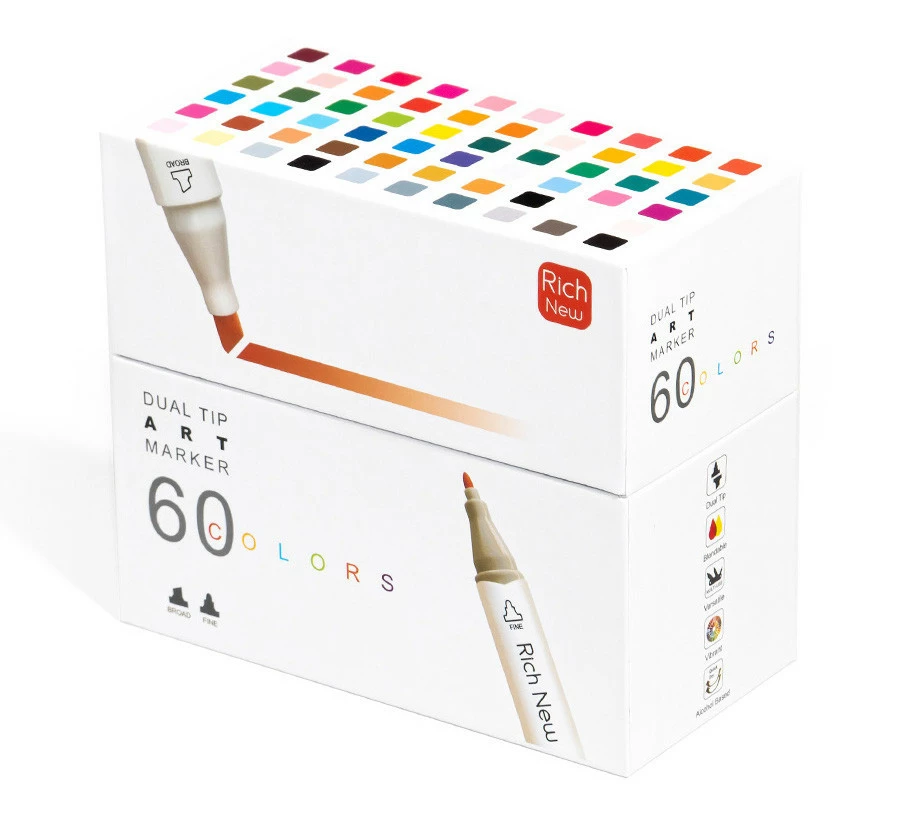 Спиртові маркери Rich New для тих, хто захоплений малюванням та каліграфією, любить створювати комікси та мальовничі ескізи. У наборі 60 маркерів різних кольорів. Корпус пластиковий гладкий. Ковпачки щільно закриваються.