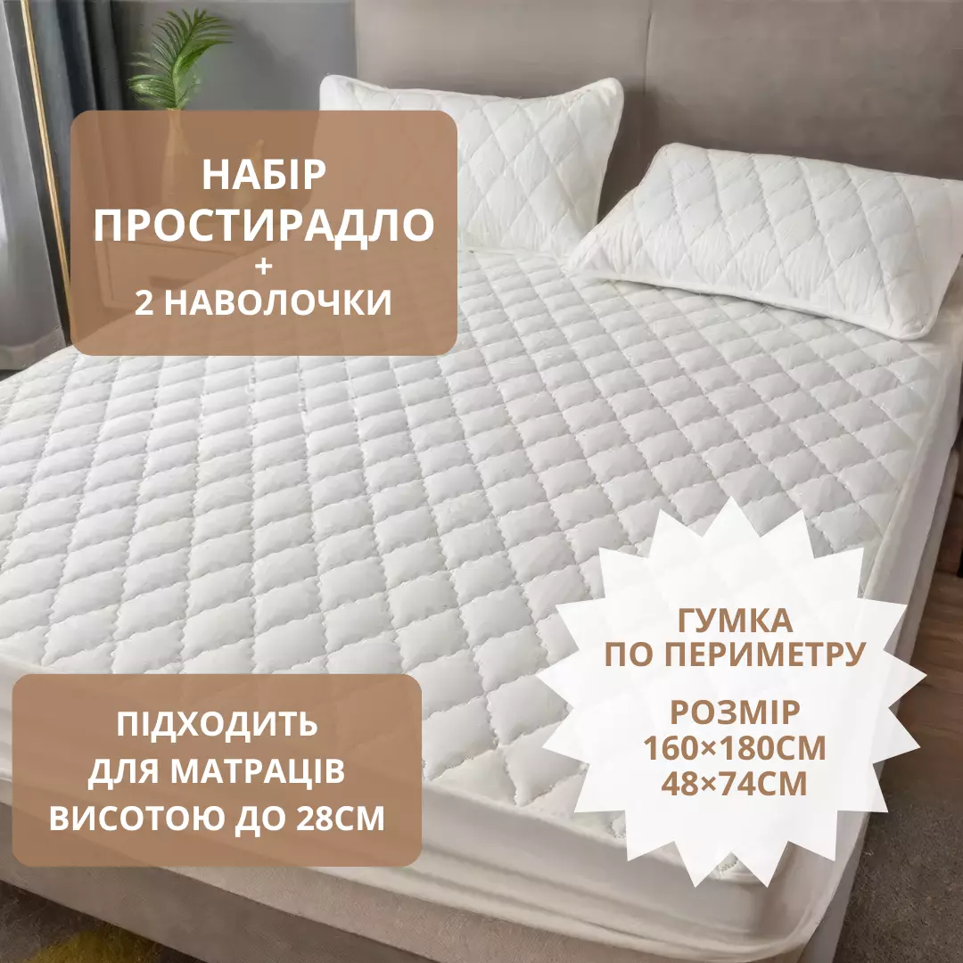 Набір простирадло-наматрацник (160×180см) водонепроникне на гумці, і 2 наволочки, в білому кольорі