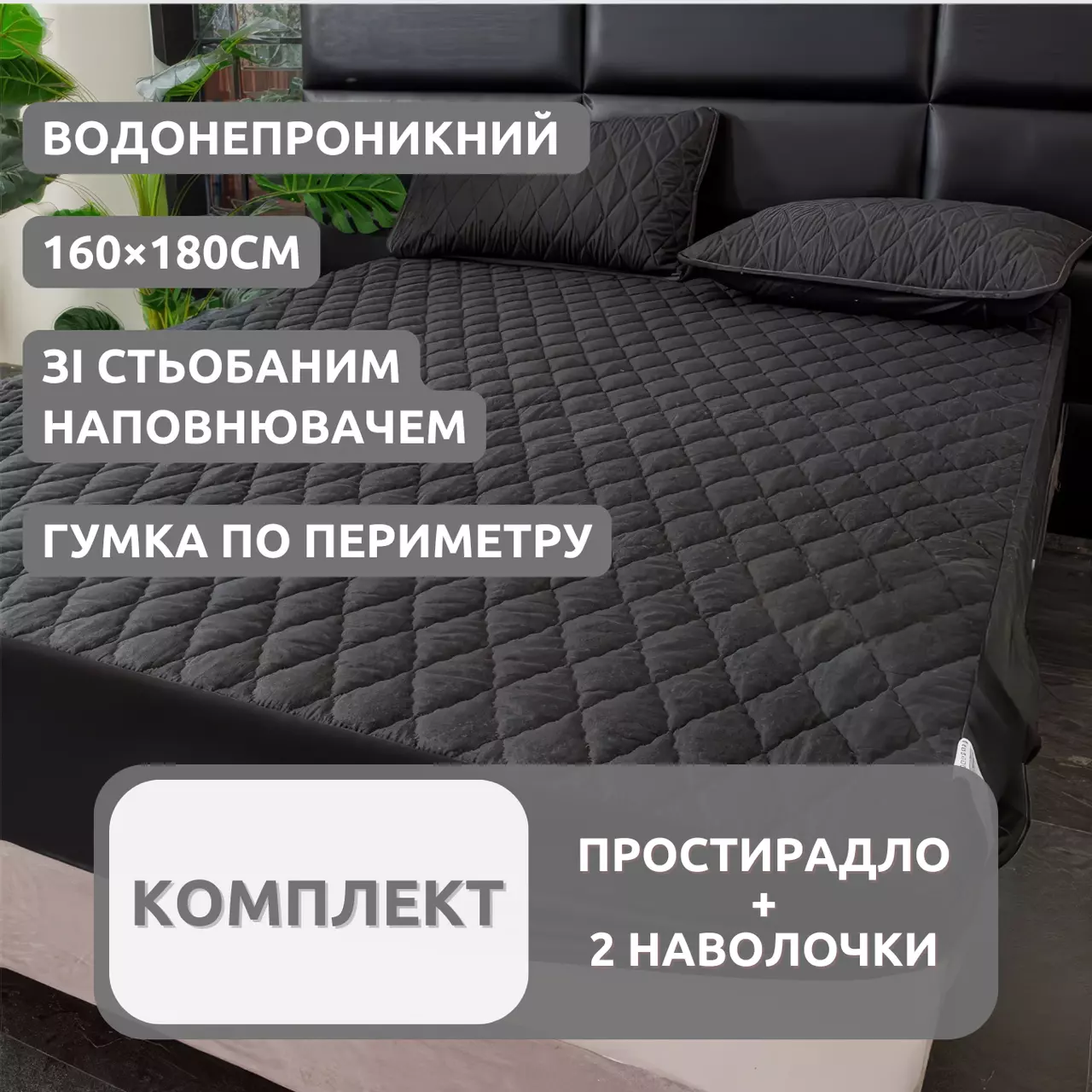 Набір простирадло-наматрацник (160×180см) водонепроникне на гумці, і 2 наволочки, в чорному кольорі