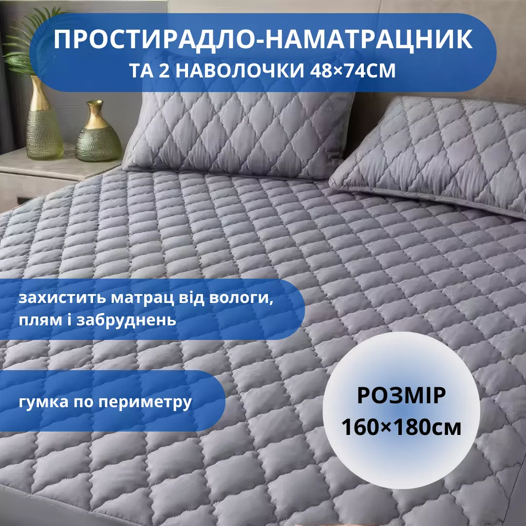 Набір простирадло-наматрацник (160×180см) водонепроникне на гумці, і 2 наволочки, в сірому кольорі