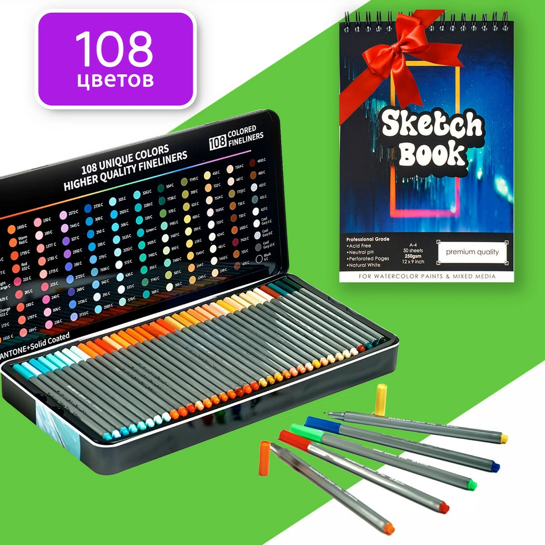 Набір різнокольорових лінерів в металевому кейсі 102 кольорів 0.4 мм + Альбом для скетчинга А4 на 50 аркушів