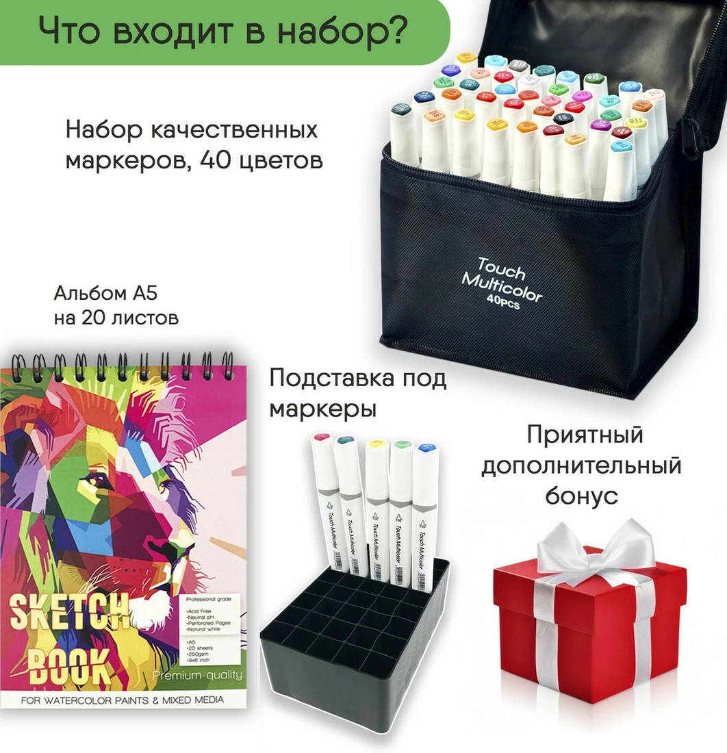 Набір скетч маркерів двосторонніх спиртових Touch Multicolor 40 кольорів + Альбом для скетчинга А5 20 аркушів