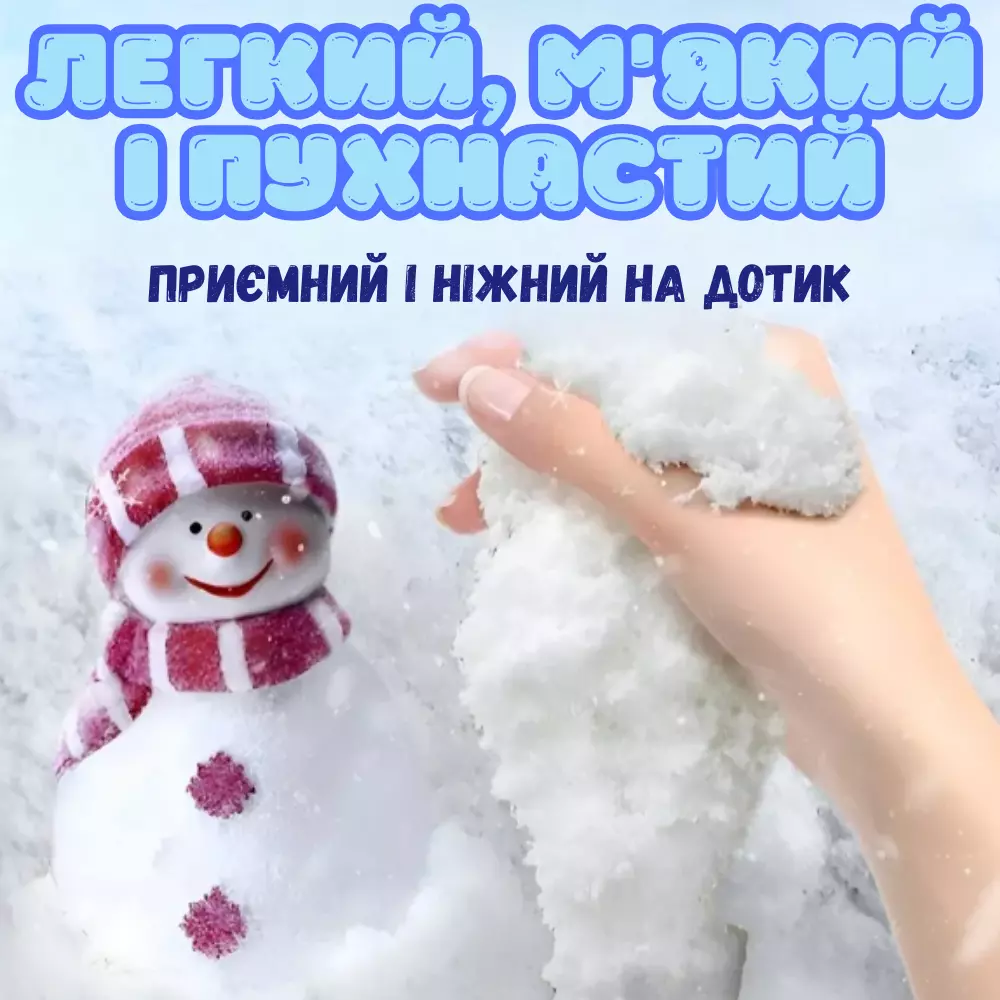 У комплекті 907 г кінетичного снігу, 3 формочки для ліплення, сніжколіп у вигляді сніговика і зручний м'який бокс-пісочниця для зберігання. Безпечний для дітей та ідеально підходить для гри вдома або в дитячому садку.