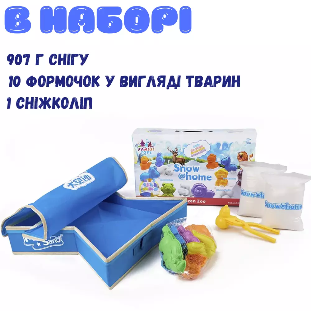 До комплекту входять 907 г кінетичного снігу, 10 формочок у вигляді тварин, сніжколіп у формі сніговика та зручний м'який бокс для зберігання. Безпечний для дітей і підходить для використання вдома або в дитячому садку.