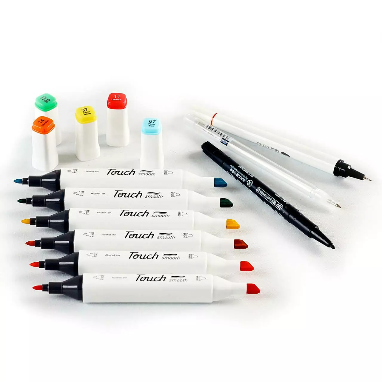 Набір двосторонніх спиртових маркерів Touch Smooth із 40 кольорів стане чудовим вибором для художників, дизайнерів і любителів скетчінгу. Маркери пропонують широкий вибір насичених відтінків, що ідеально підходять для створення мальовничих ілюстрацій, каліграфії або коміксів. Завдяки якісним чорнилам на спиртовій основі, вони забезпечують плавні переходи між кольорами та рівномірне покриття.