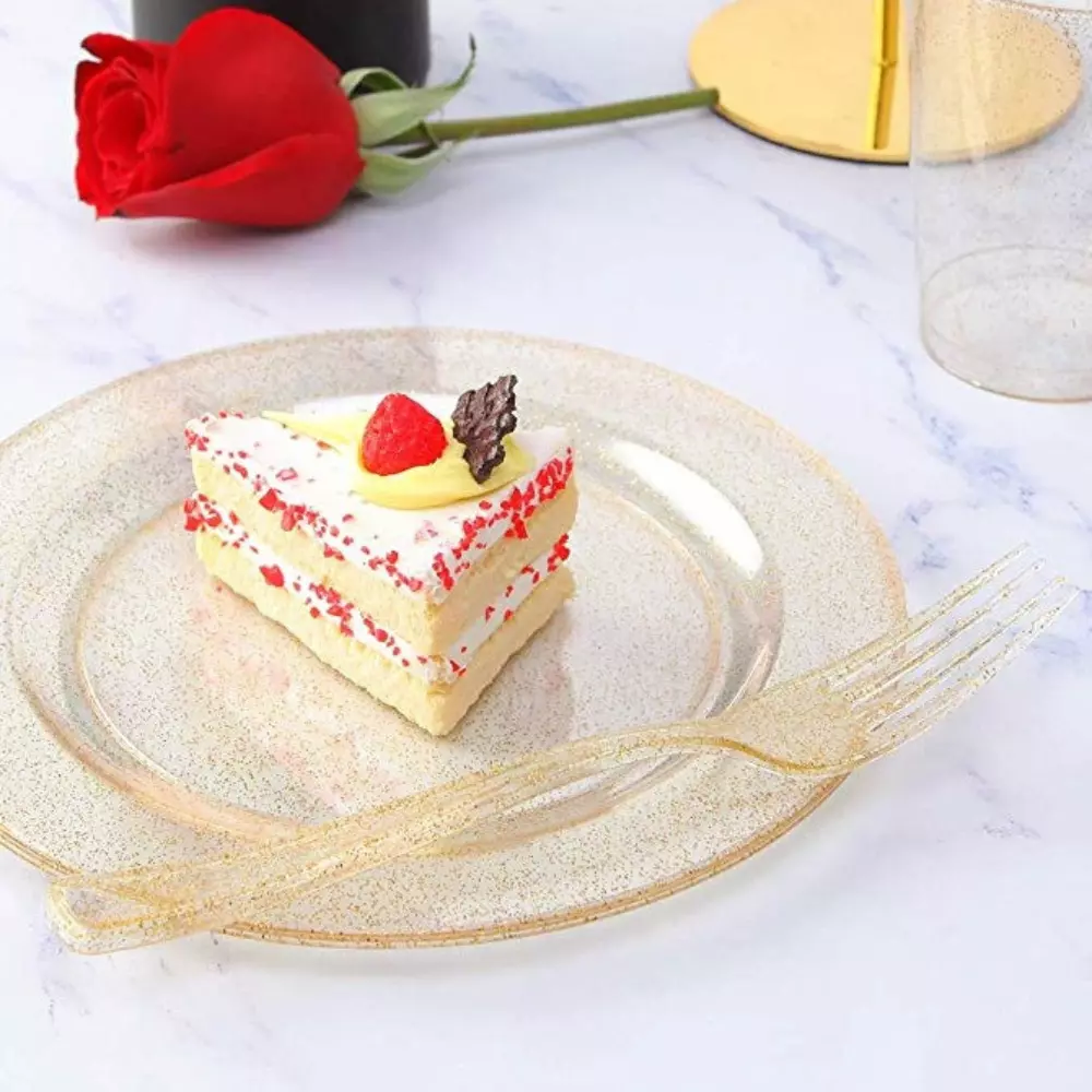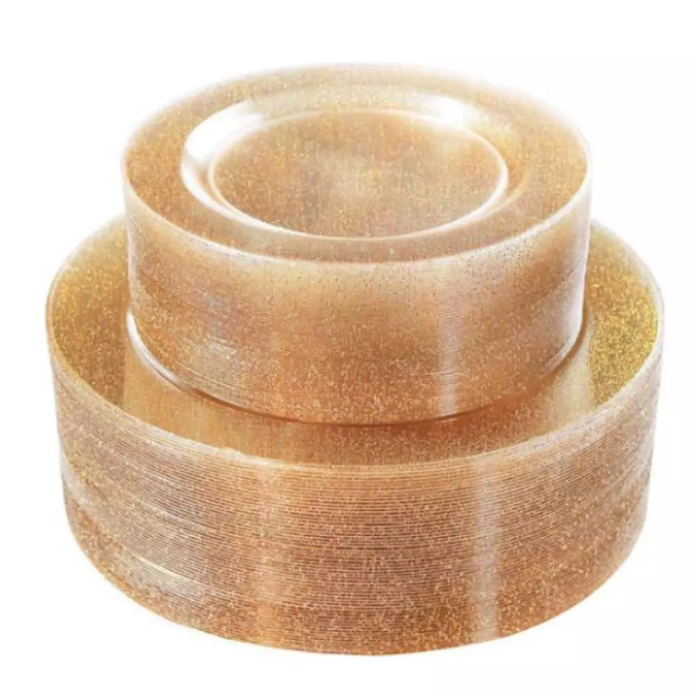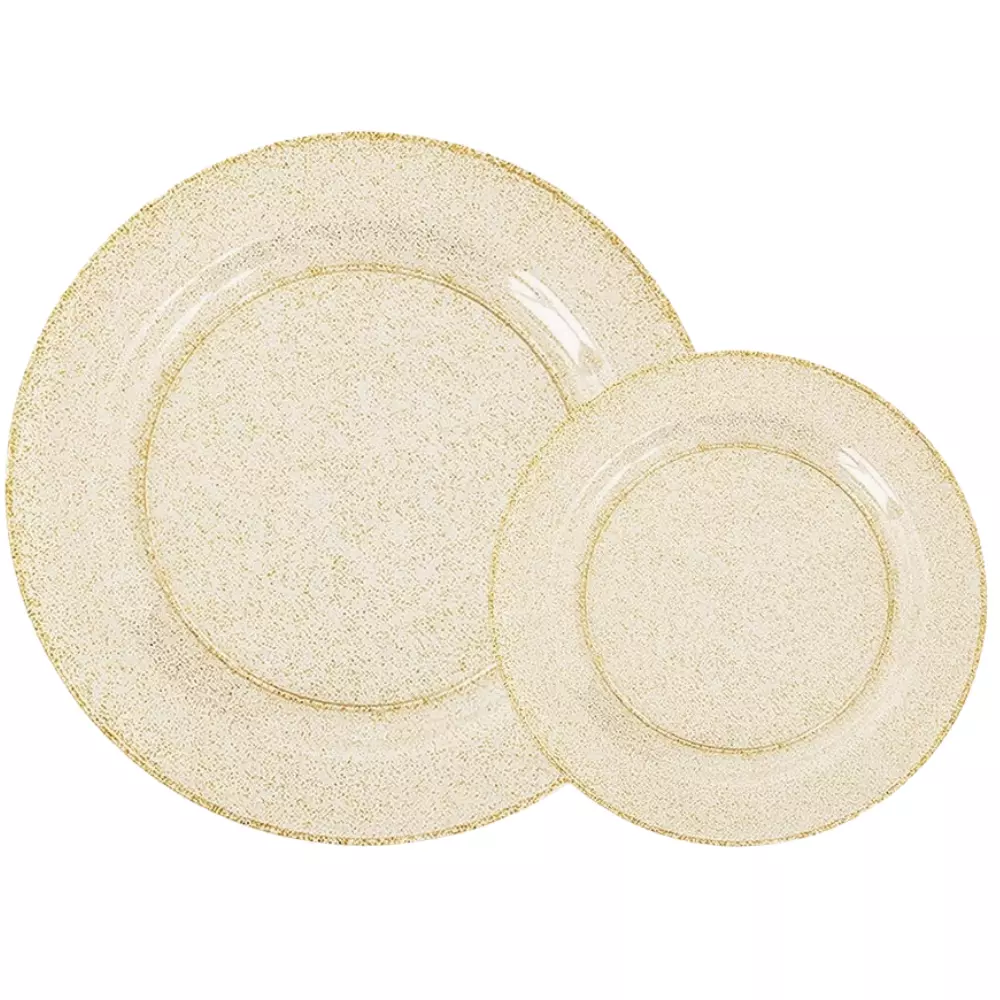 Набір тарілок пластикові 12 штук круглі,обідні 26 см і десертні 19 см, золоті прозорі з блискітками
