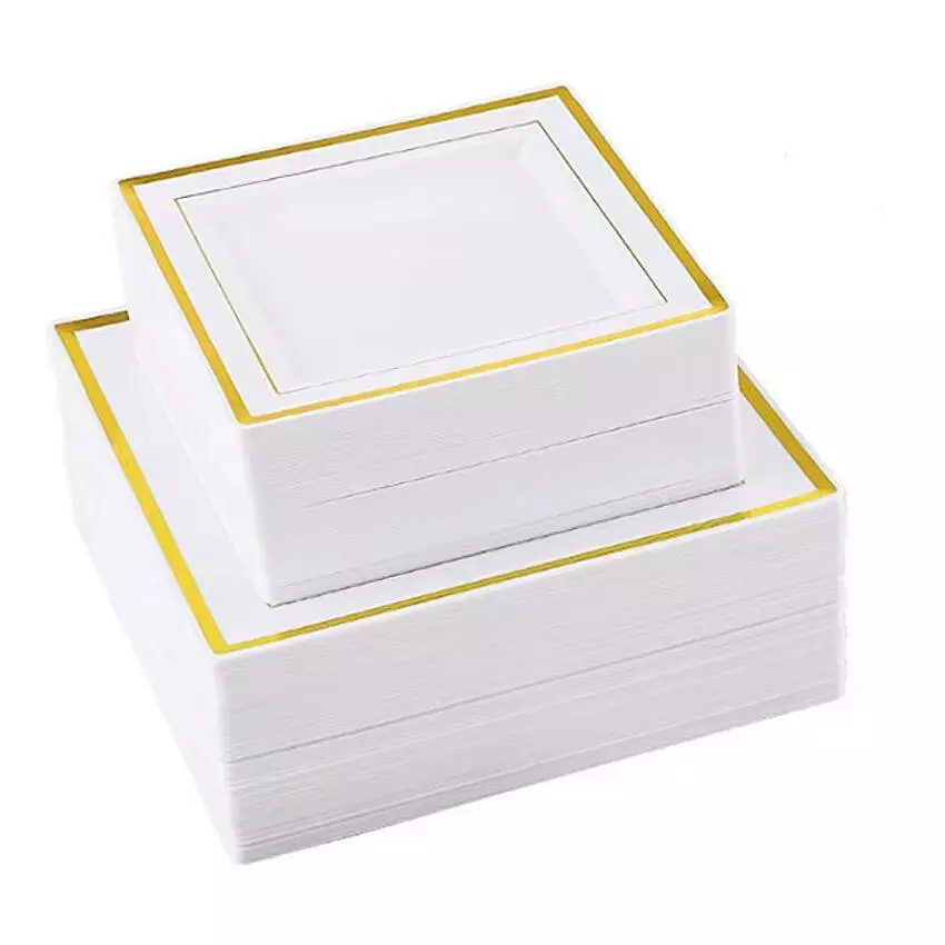 Набір тарілок пластикових 12 шт квадратні, десертні 16.5 см і обідні 24 см, із золотистим контуром