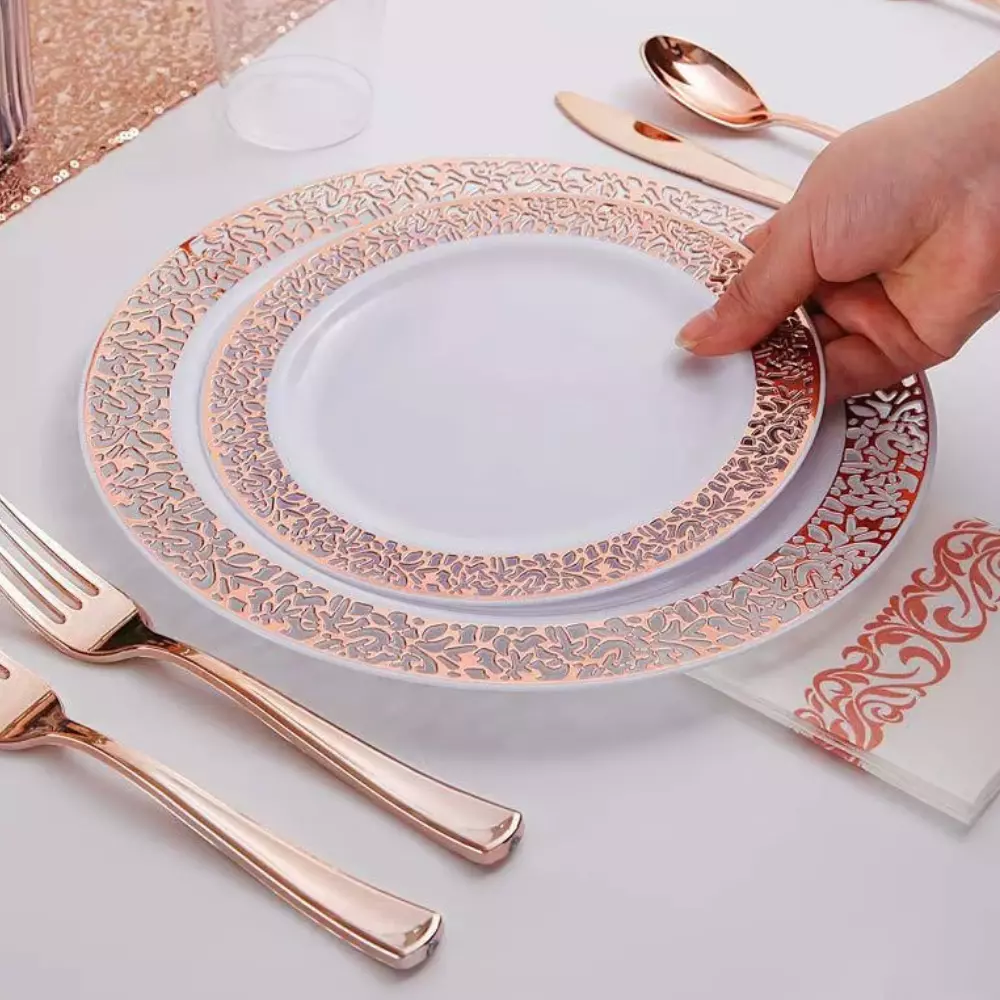 Тарілки виконані з міцного пластику високої якості, стійкого до пошкоджень і легко очищуваного. Легкі та зручні у використанні, вони підходять для сервірування як гарячих, так і холодних страв. Цей набір забезпечить не тільки комфорт, а й стильну атмосферу на будь-якому торжестві.