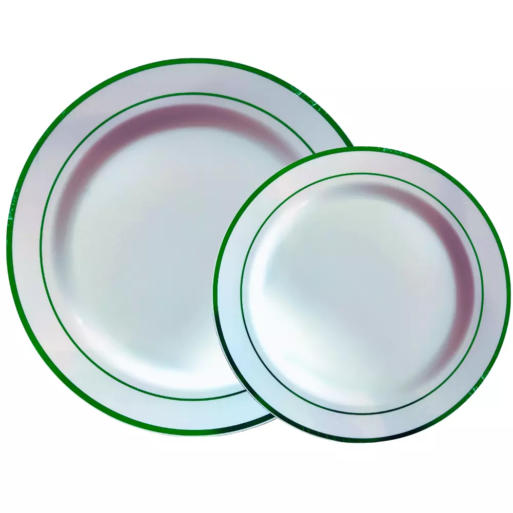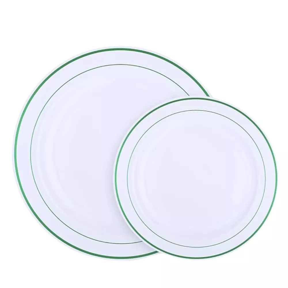 Набір тарілок пластикових круглі 12 шт, десертні 19 см і обідні 26 см, білі з зеленим контуром
