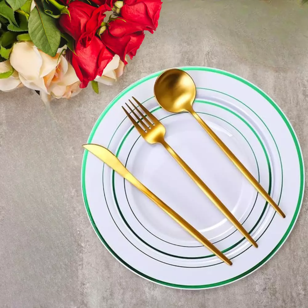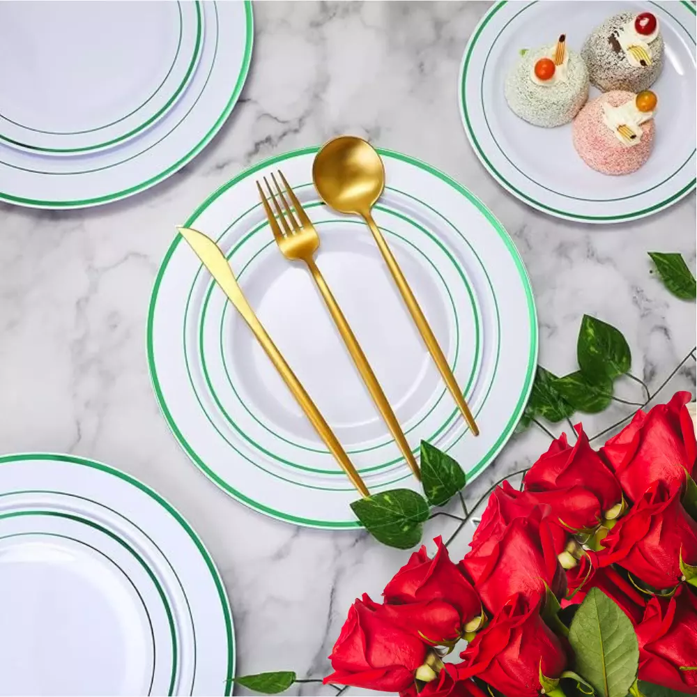 Тарілки виготовлені з міцного пластику високої якості, стійкого до деформації та механічних пошкоджень, що гарантує їхню довговічність. Вони підходять для подачі як гарячих, так і холодних страв, забезпечуючи зручність у використанні та стильну презентацію. Такий набір стане відмінним вибором для банкетів, весіль та інших урочистих заходів.