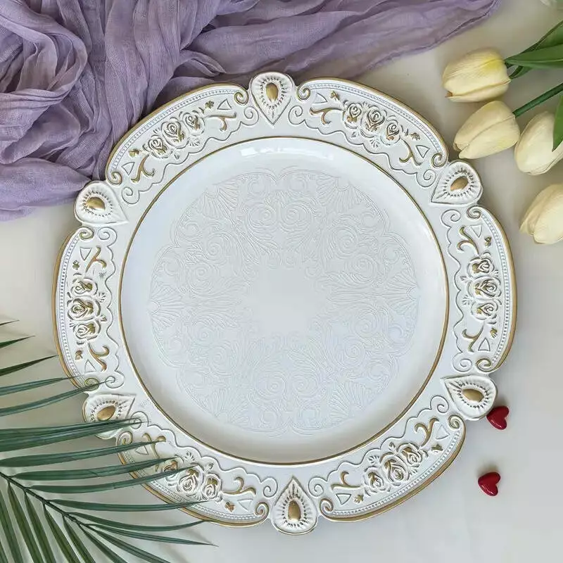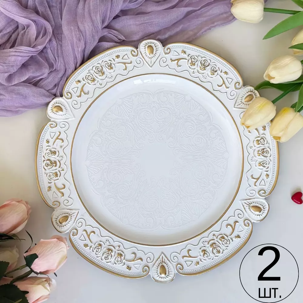 Набір тарілок пластикових круглі,2 шт для сервірування столу 33 см, підставні, багаторазові, білі з золотистим візерунком