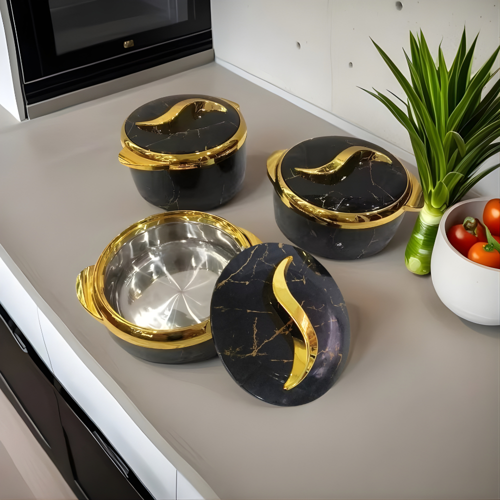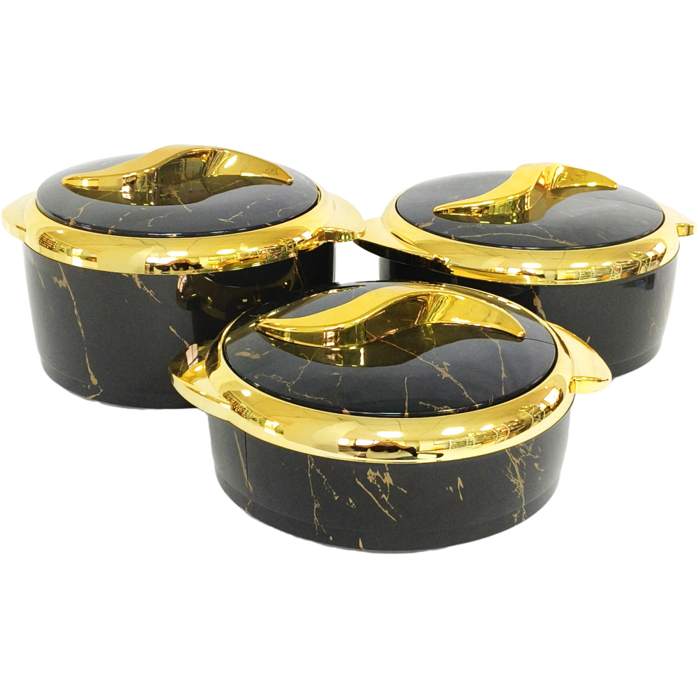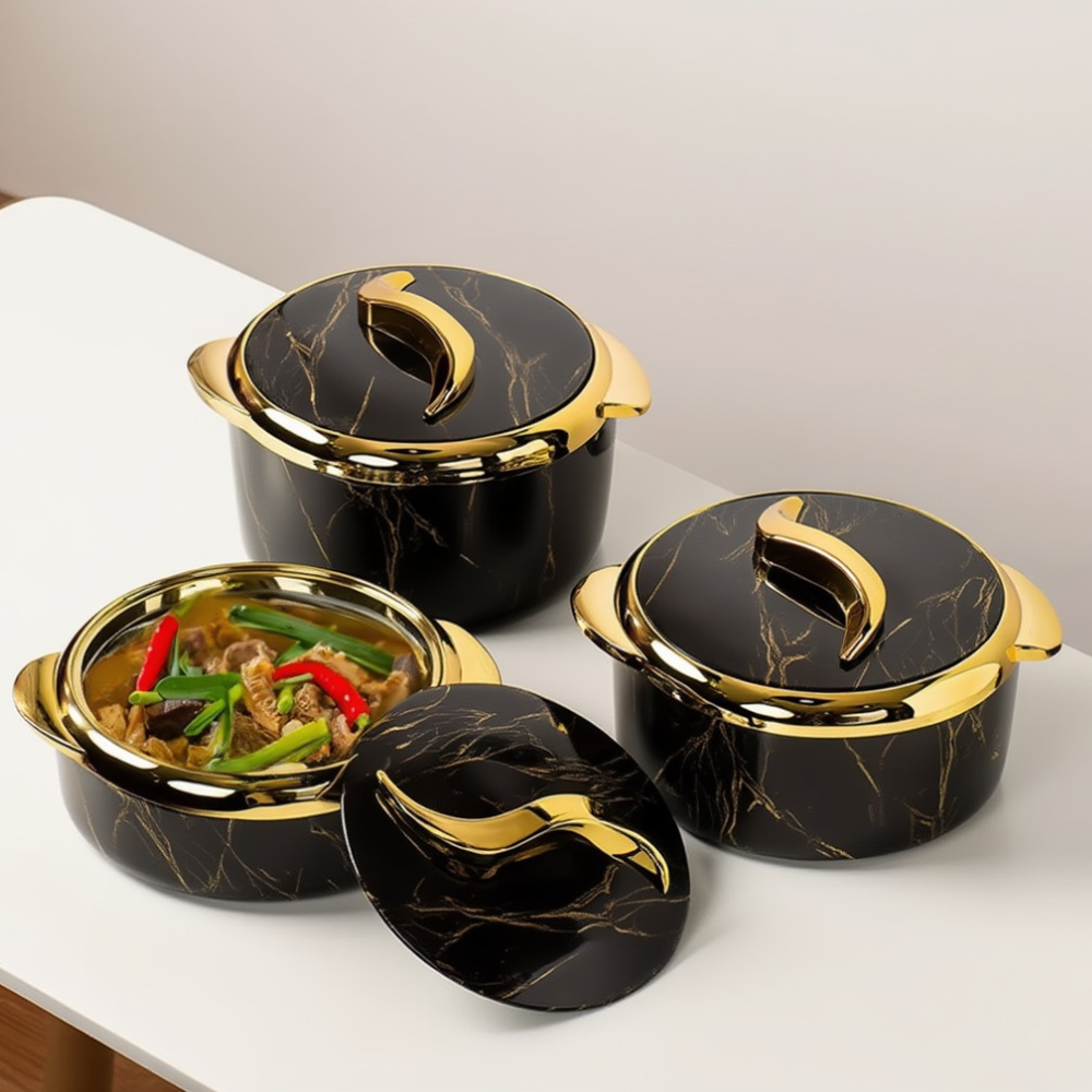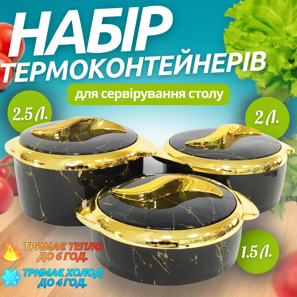 Контейнери оснащені щільними кришками зі зручними ручками, що дозволяє ефективно утримувати температуру вмісту. Набір відмінно підходить для повсякденного використання вдома, а також для святкових заходів, банкетів і сімейних застіль.