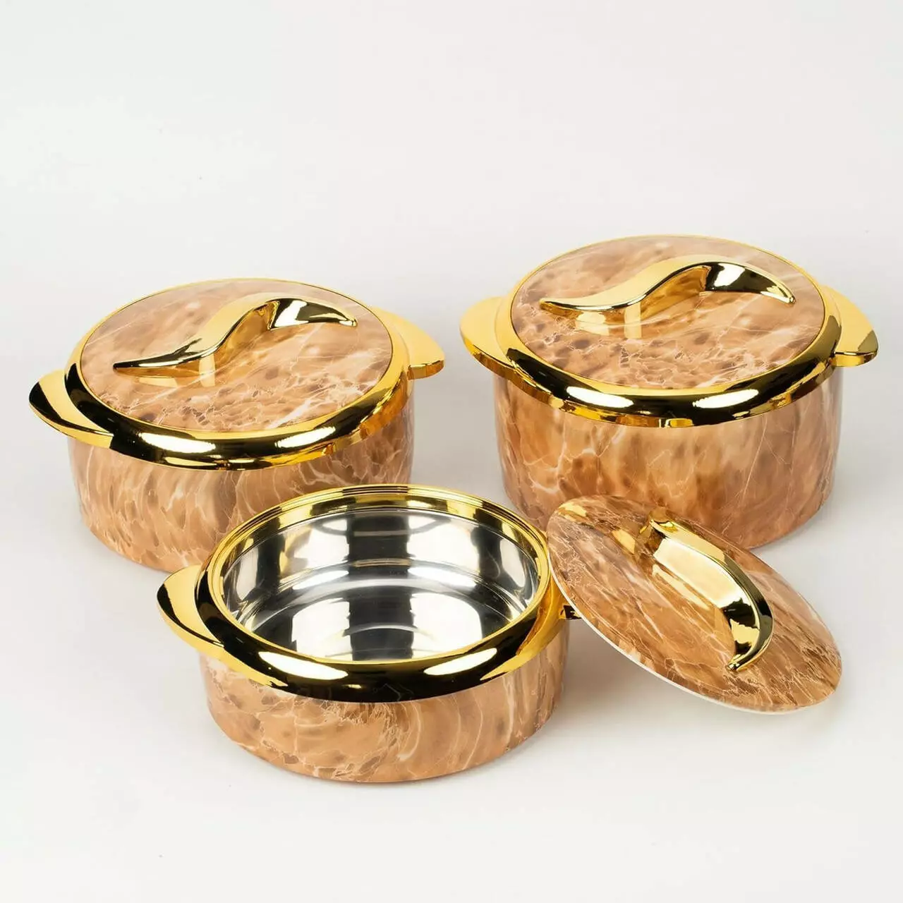 Контейнери оснащені щільними кришками зі зручними ручками, що дозволяє ефективно утримувати температуру вмісту. Набір чудово підходить для повсякденного використання вдома, а також для святкових заходів, банкетів і сімейних застіль.
