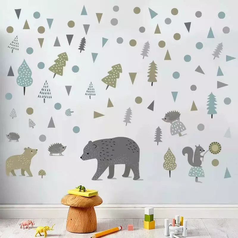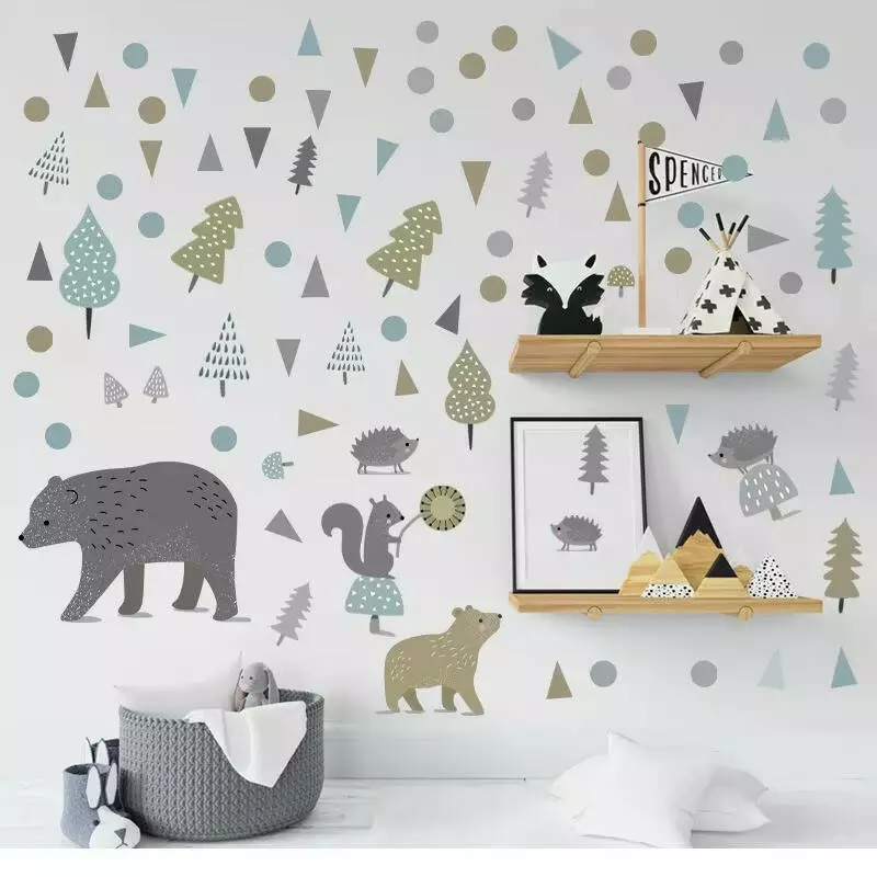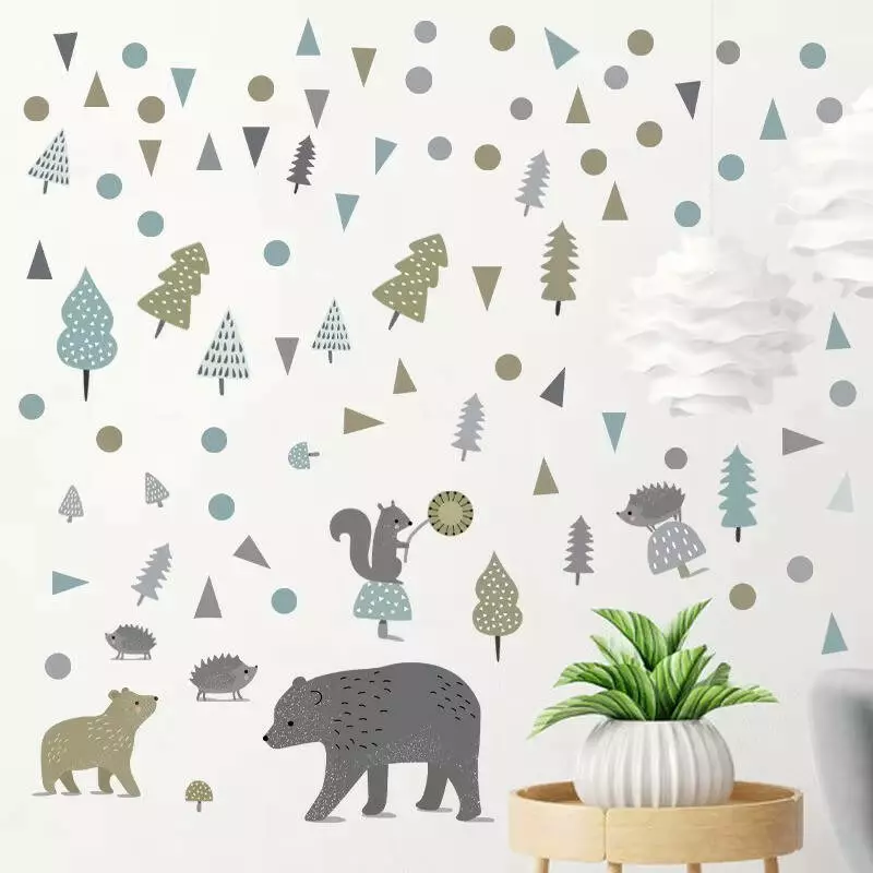 Набір вінілових наліпок «Лісові мешканці» перетворить стіни дитячої кімнати на затишний куточок природи. Поєднання трикутників, ялинок і дерев в абстрактному стилі дає змогу створити власну композицію, що милуватиме око. Веселі лісові мешканці, як-от два ведмеді, білка та два їжачки, додадуть атмосфері теплоти та затишку.