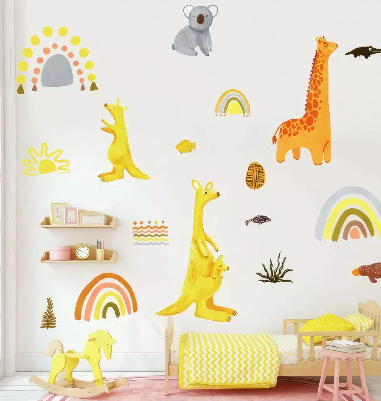 Набір вінілових наклейок «Зоопарк» перетворить будь-яку дитячу кімнату на справжній куточок пригод. Барвисті зображення жирафа, двох кенгуру, коали, крокодила і качкодзьоба наповнять простір атмосферою дикої природи і радості. Наліпки веселки та сонця, що доповнюють композицію, додадуть інтер'єру теплої та життєрадісної атмосфери.