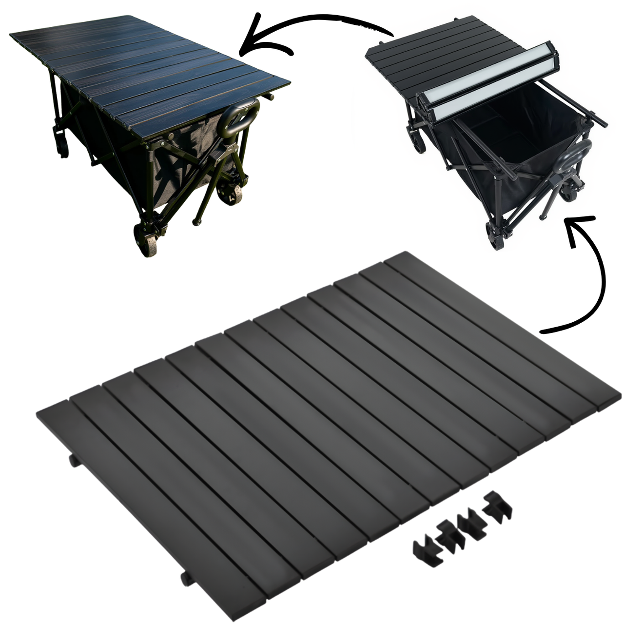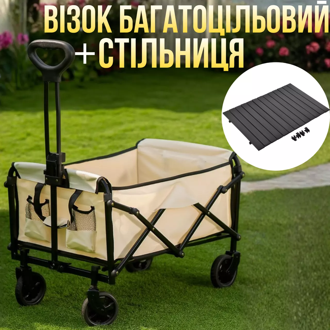 Додатково тележка комплектується залізною стільницею, яка встановлюється зверху та перетворює тележку на зручний мобільний стіл для пікніка, приготування їжі або розміщення предметів. Стільниця виконана з міцного заліза та згортається в рулон, що робить її компактною при зберіганні та перевезенні.