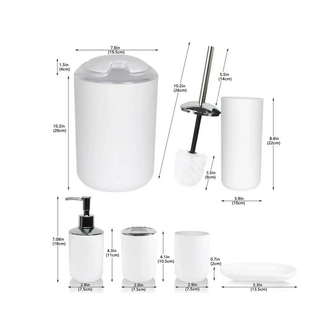 Лаконічні аксесуари виконані в одному стилі, доповнять інтер'єр і гармонійно виглядатимуть у поєднанні з сантехнікою та меблями. Комплект складається з мильниці, підставки для зубних щіток, склянки, диспенсера, йоржика та відра.