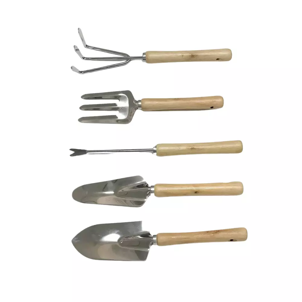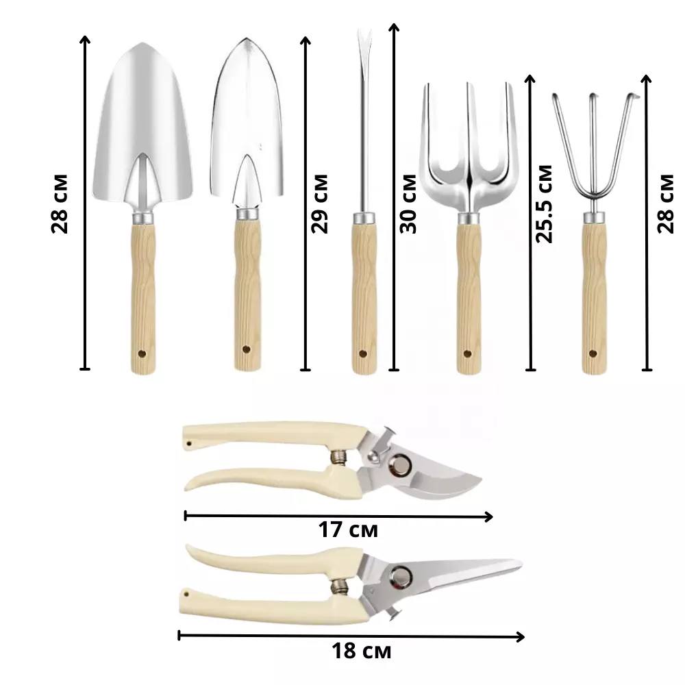 Повний набір інструментів: 5 ручних (лопатки, вила, граблі, кореневий видаляч) + 2 секатори