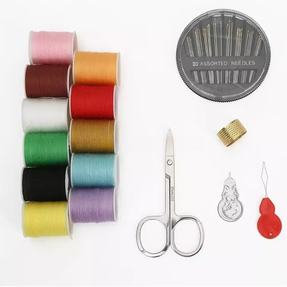 набору входять набір голок, наперсток, ножиці, ниткозшивач, що
