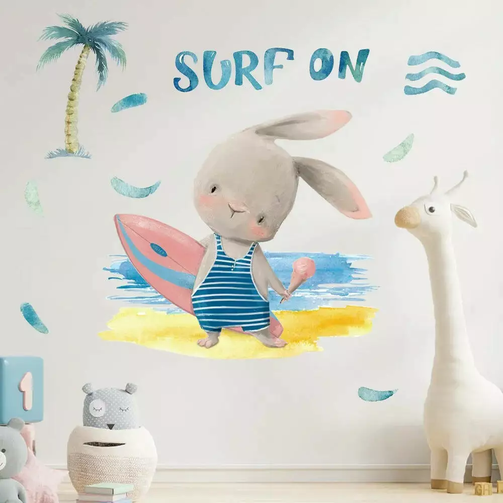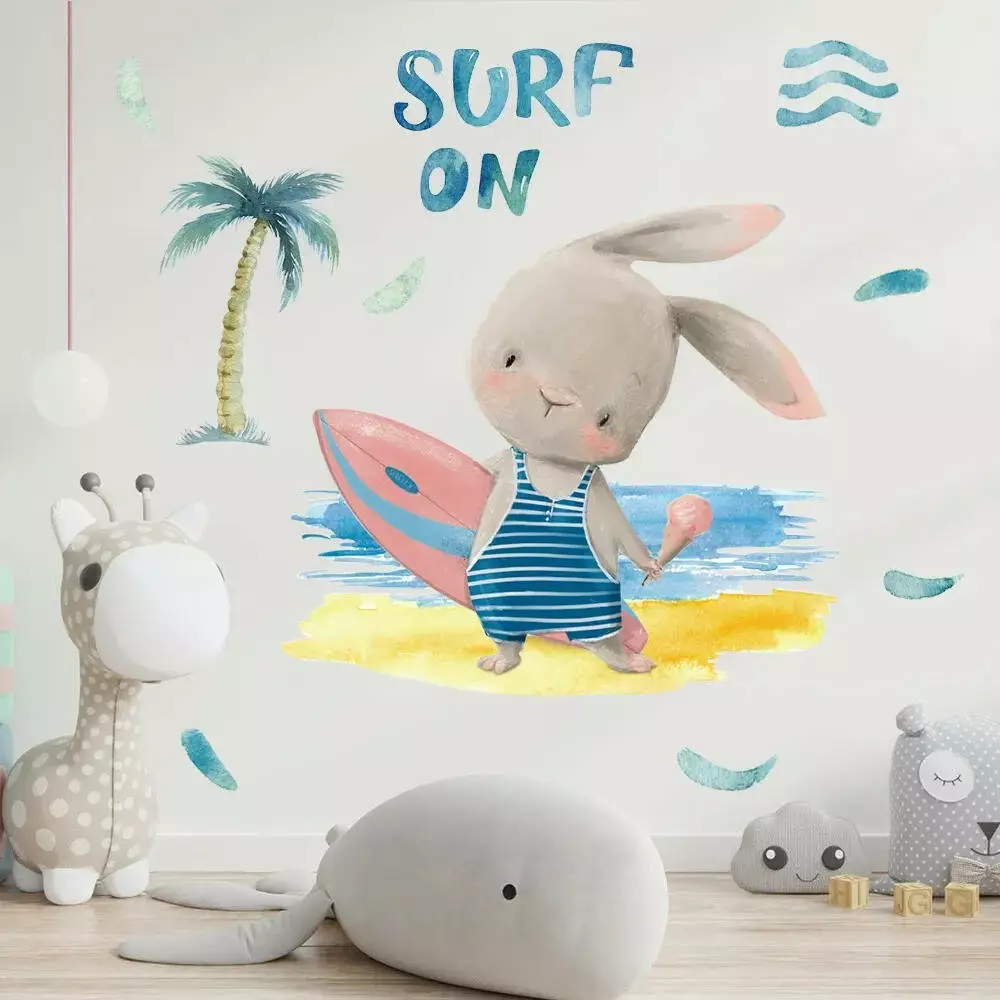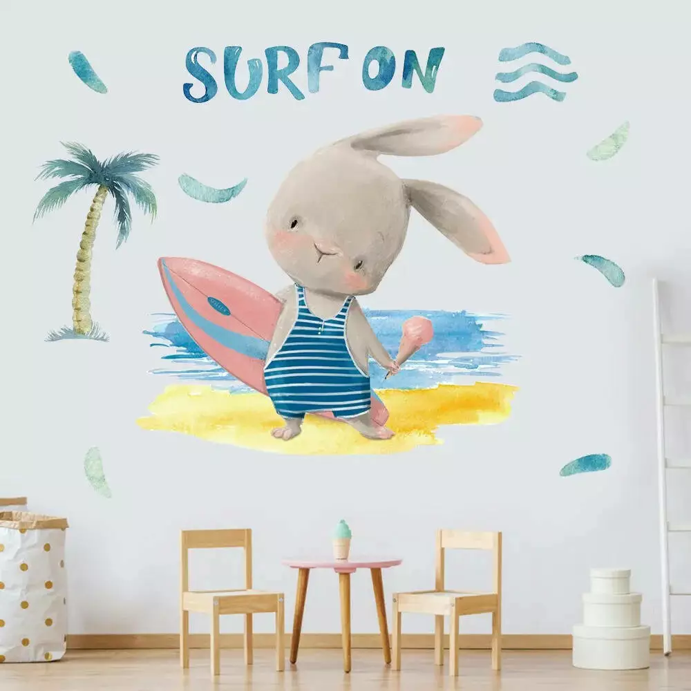Наклейка декоративна вінілова в дитячу кімнату «Зайчик серфінгіст» для дівчаток і хлопчиків 30х60 см