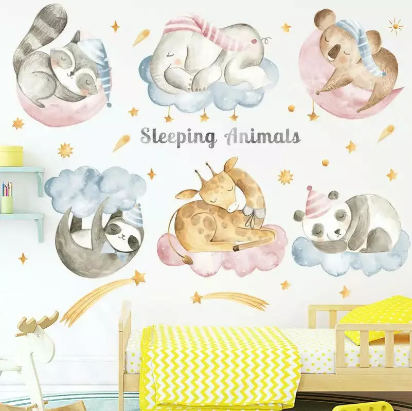Створіть у дитячій кімнаті атмосферу ніжності та затишку за допомогою набору вінілових наліпок «Сплячі звірята». Ця композиція ідеально підходить як для хлопчиків, так і для дівчаток, додаючи м'якості та гармонії в інтер'єр. На наліпках зображені шість милих звірят - слоненя, панда, жираф, лінивець, коала та єнот - які солодко сплять на хмарах. Такий дизайн допомагає створити затишний простір для відпочинку та сну вашої дитини.