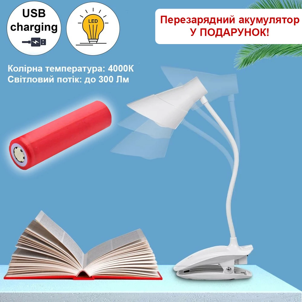 Настільна світлодіодна акумуляторна LED лампа на прищіпці с USB зарядкою