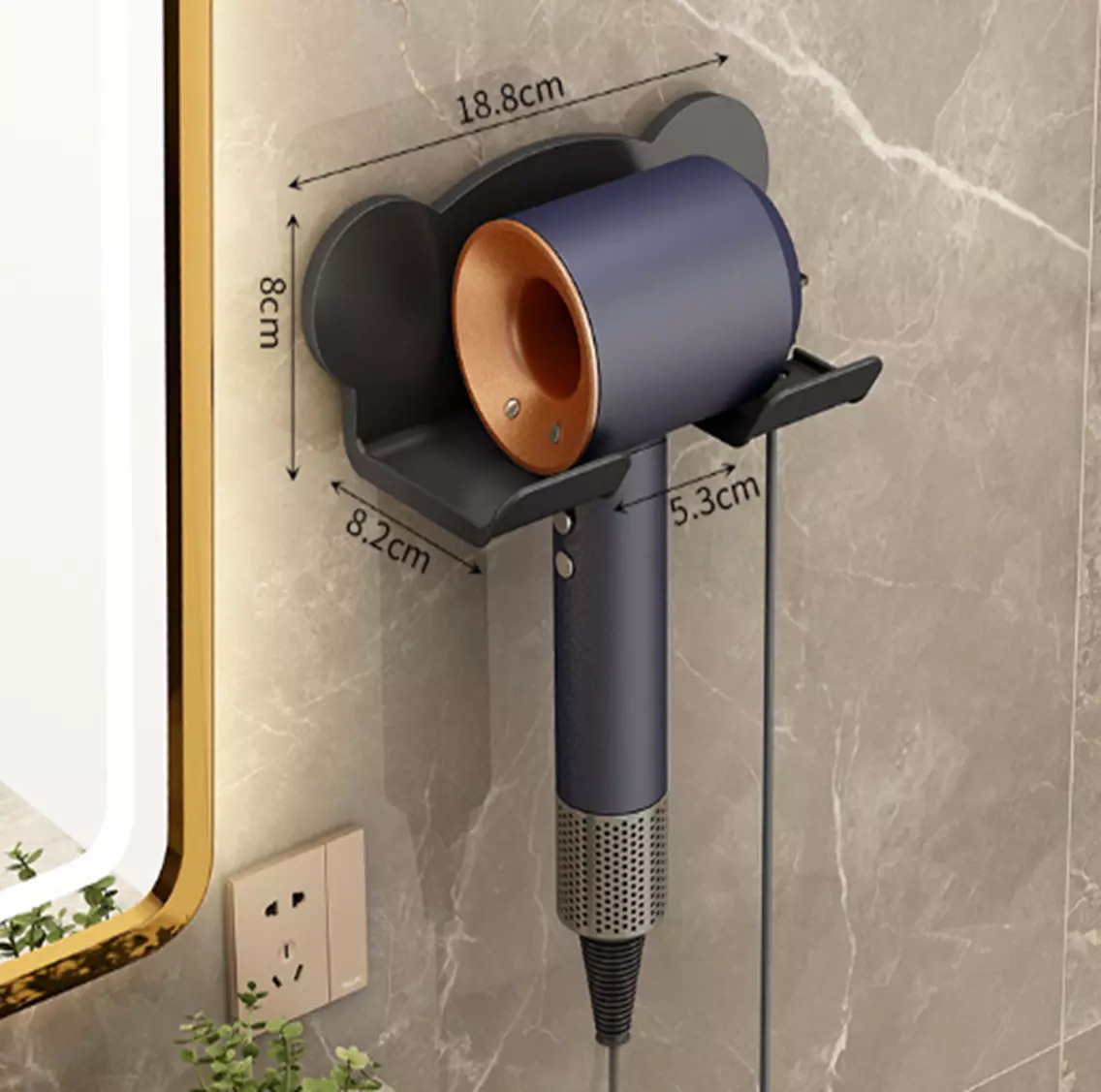 Настінний тримач для фена із пластику, аксесуар для ванної кімнати, 18,8×8,2×8 см, чорний колір