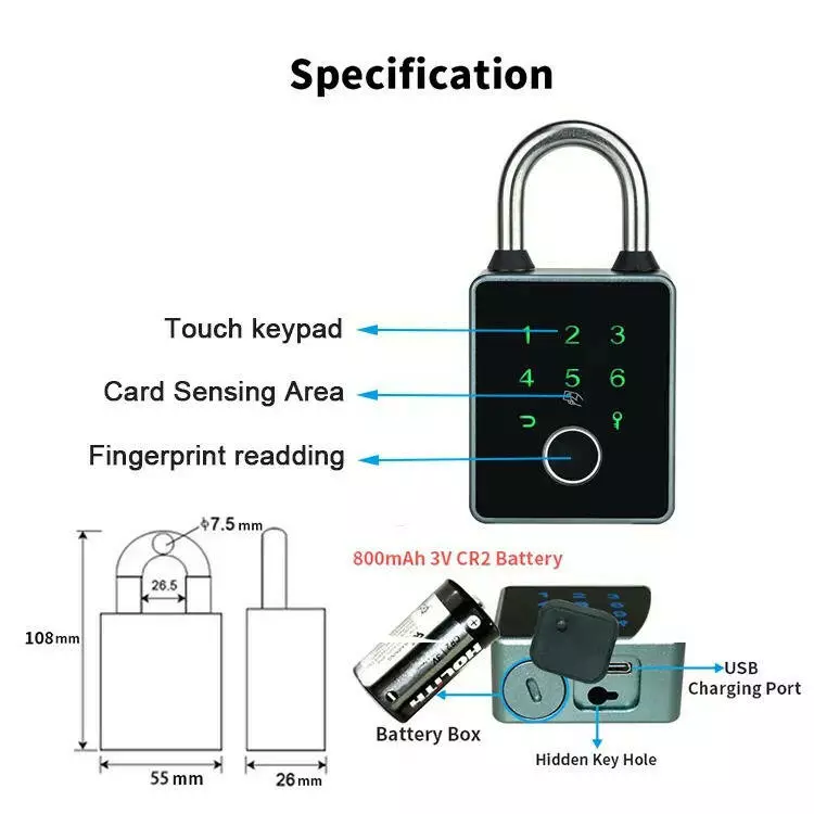 Виготовлений із міцного алюмінієвого сплаву, замок захищений від впливу води та пилу за стандартом IP67, що робить його придатним як для внутрішнього, так і для зовнішнього використання. Замок працює від 800mAh 3V CR2 батареї, що забезпечує довгу роботу. За необхідності зарядки, замок оснащений USB-портом, а в комплекті також передбачені два ключі для резервного доступу.