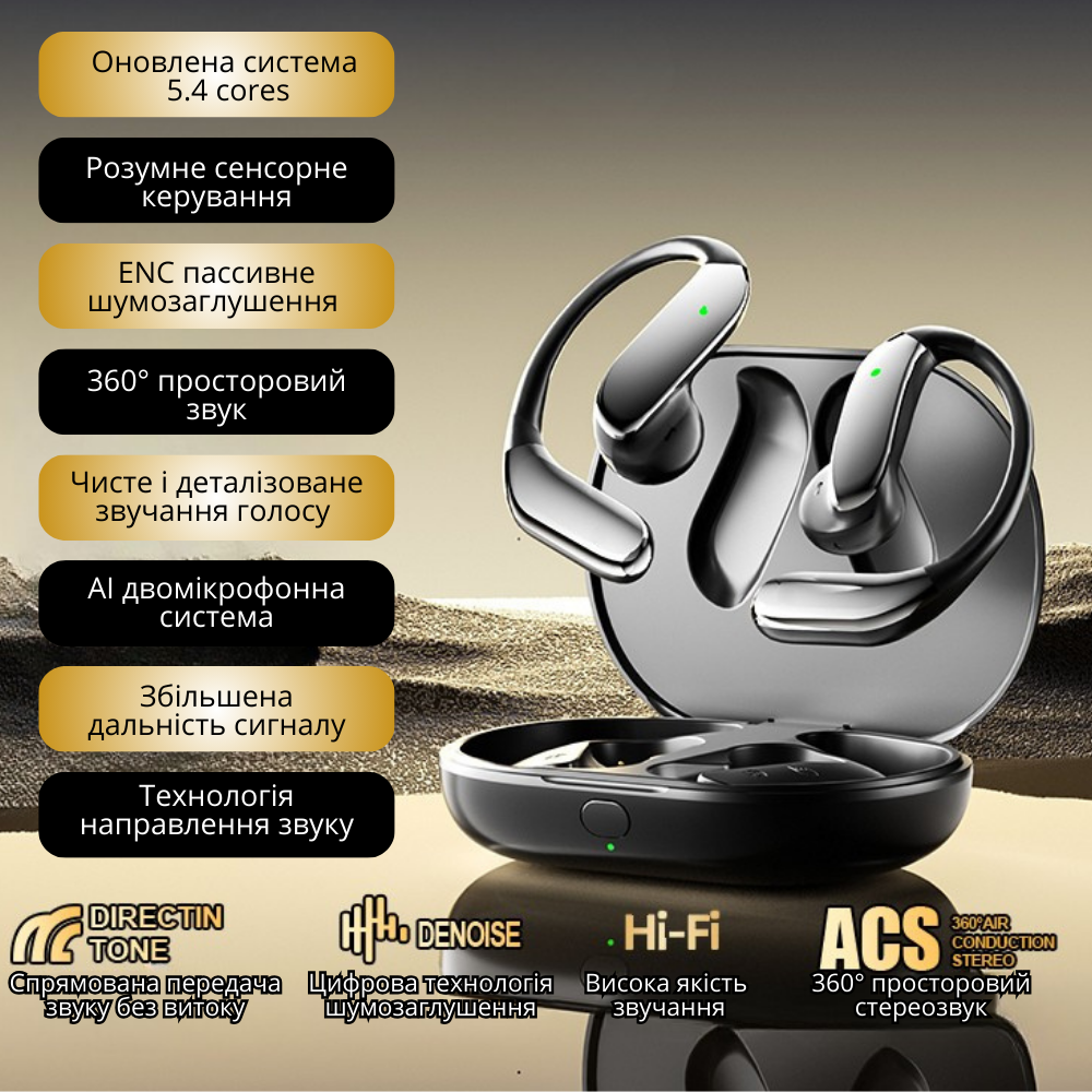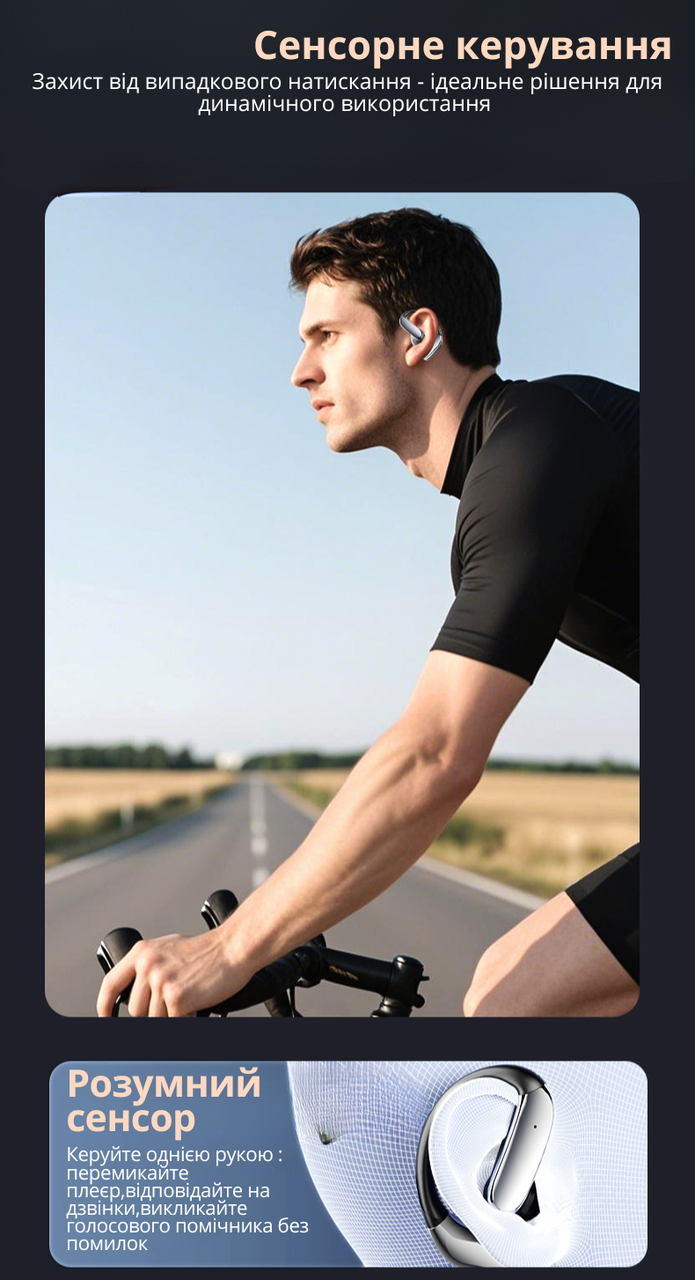 Сенсорне управління з функцією інтелектуального відбитка дозволяє легко перемикати треки, регулювати гучність і відповідати на дзвінки. Ергономічна конструкція щільно фіксується на вухах і виключає випадання навіть при активному використанні.