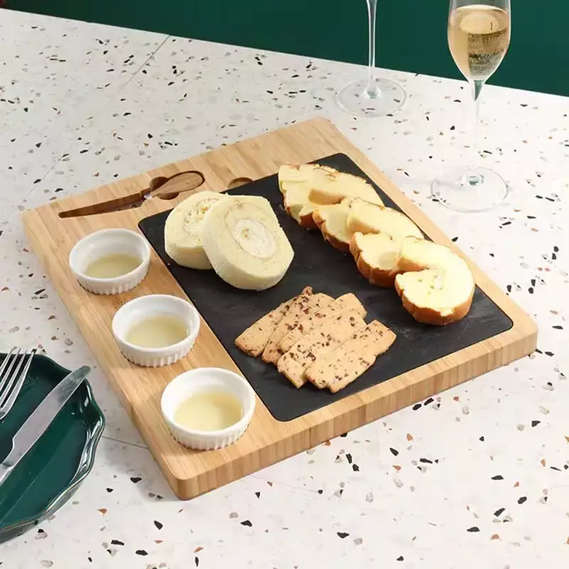 Дошка для сиру і закусок бамбукова з ножем і соусниками, менажниця дерев'яна для нарізки 38x33x2.8 см