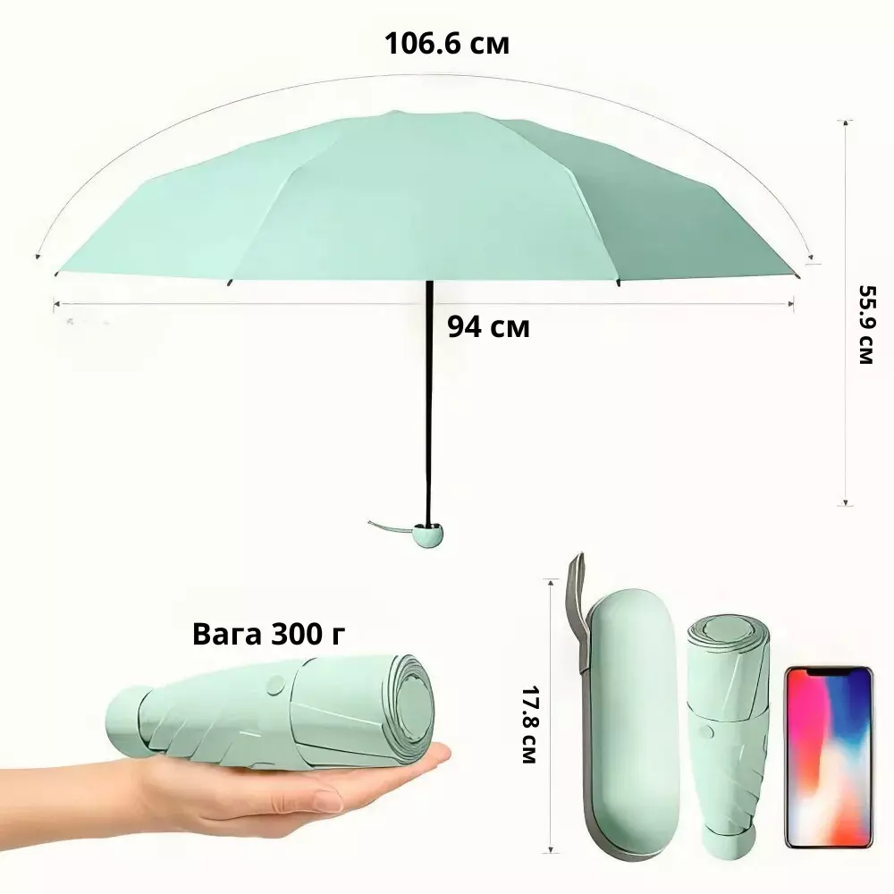 Ця компактна та стильна парасолька стане вашим надійним захистом від дощу та сонця. Завдяки своїм невеликим розмірам вона легко поміщається в сумку або рюкзак, а міцний ударостійкий футляр на блискавці забезпечує зручне зберігання.