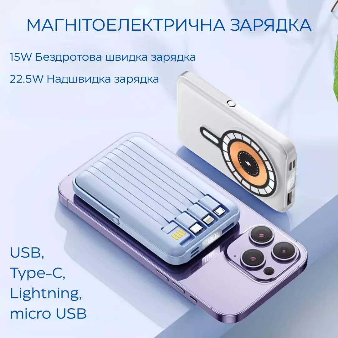 Магнітне кріплення надійно фіксує акумулятор на корпусі смартфона, а бездротова зарядка потужністю 15 Вт автоматично активується під час під'єднання. Ємність 10000 мАг дає змогу заряджати пристрої кілька разів, а дротова зарядка з вихідною потужністю 22.5 Вт і входом 20 Вт забезпечує високу швидкість відновлення заряду. Вбудований дисплей відображає рівень заряду у відсотках, що дає змогу точно контролювати енергію, що залишилася.