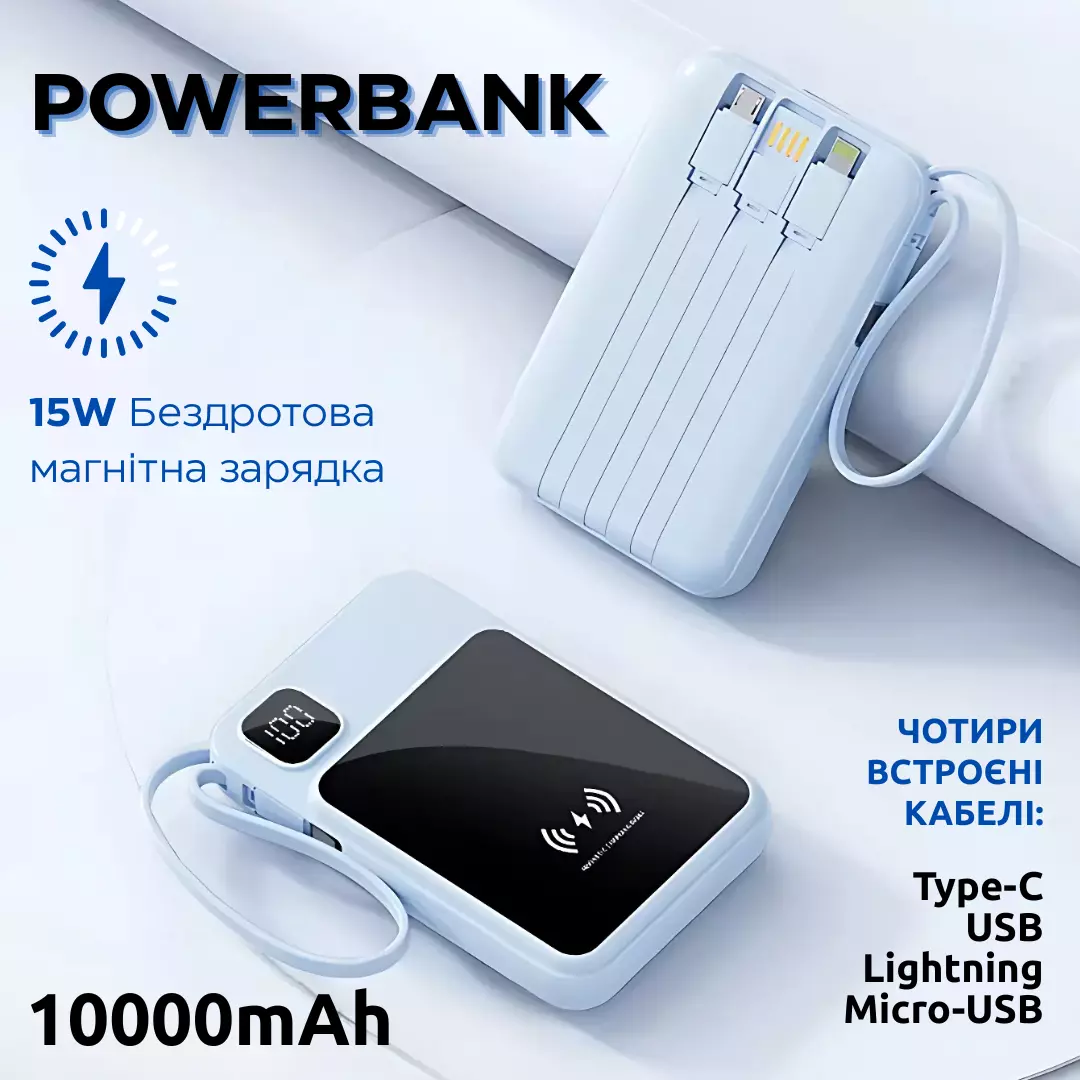 Павербанк бездротовий магнітний 10000мАг Powerbank зі швидкою зарядкою і 4 вбудованими кабелями, блакитний