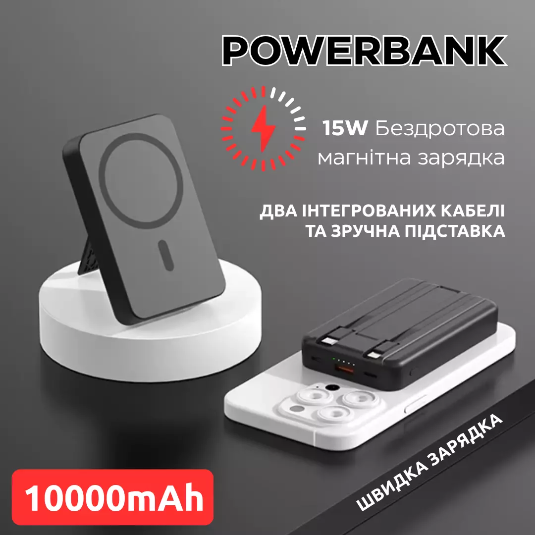 Павербанк бездротовий магнітний 10000мАг Powerbank зі швидкою зарядкою, відкидною підставкою, чорний