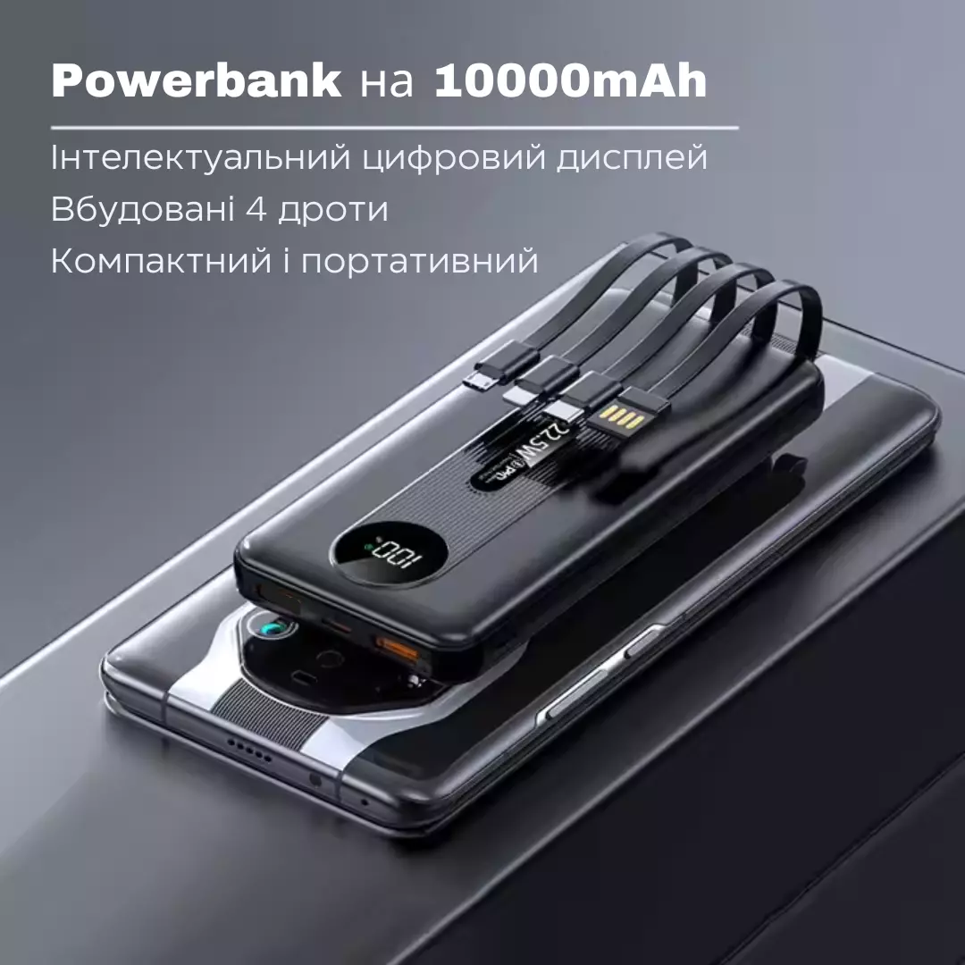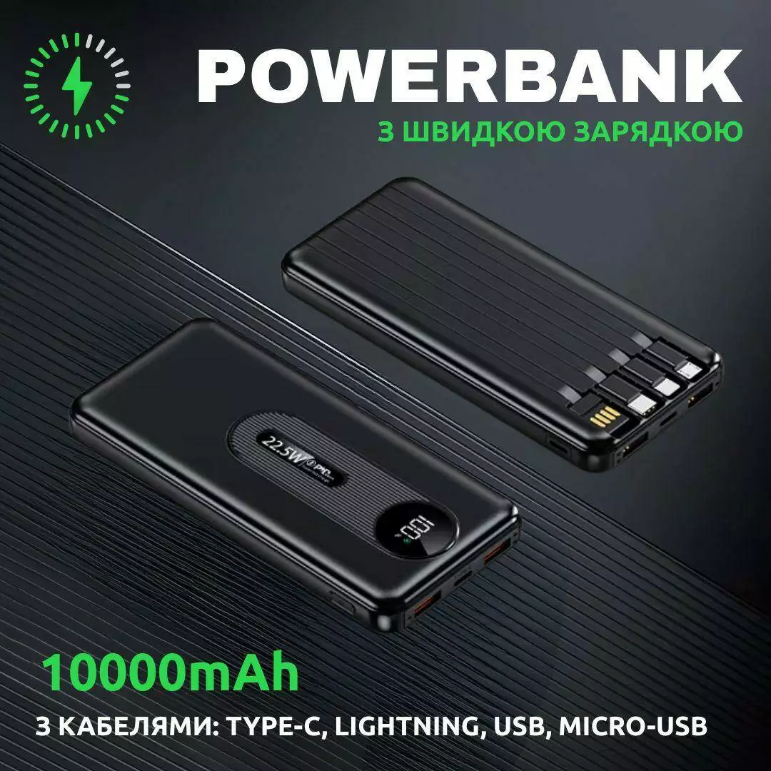 Павербанк зі швидкою зарядкою 10000мАг, УМБ Powerbank з вбудованими кабелями 22. 5W Black