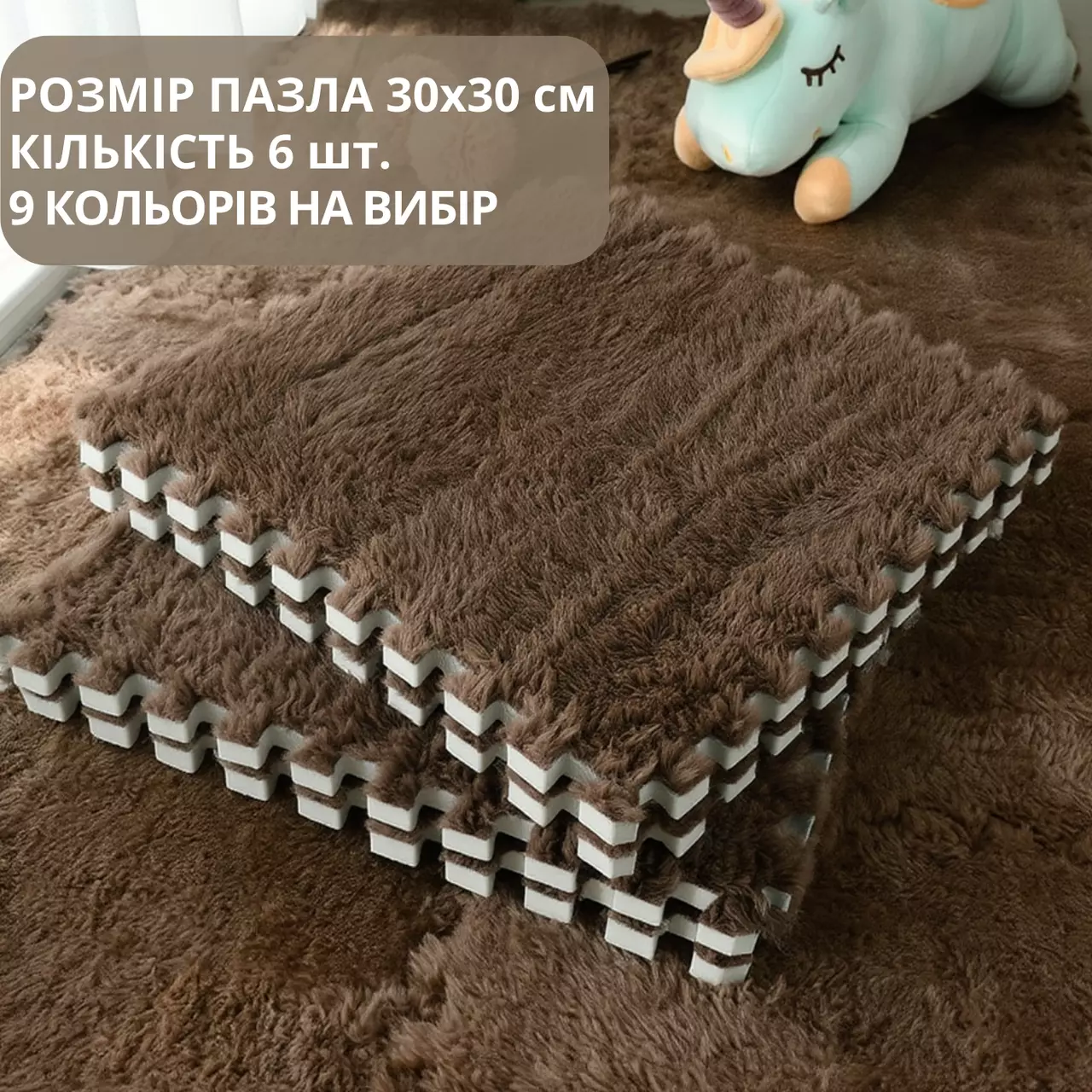 Пазл килимок м'який термокилим плюшевий 60х90см, 6 пазлів тепла підлога, термоковрик для дому, в дитячу кімнату один колір сoffee