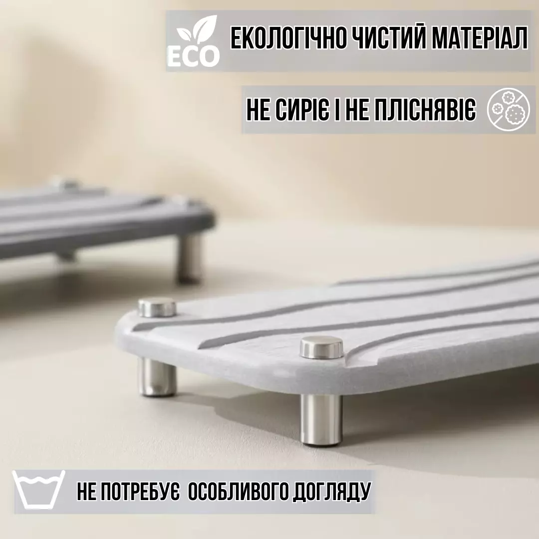 Ця універсальна підставка з діатоміту світло-сірого кольору поєднує в собі природні властивості та сучасний дизайн. Діатоміт - натуральний матеріал, який ефективно поглинає вологу за 30 секунд, запобігаючи розвитку цвілі та вогкості. Це робить підставку ідеальним вибором для використання в місцях із підвищеною вологістю, як-от ванна кімната або кухня.