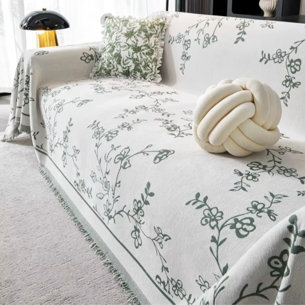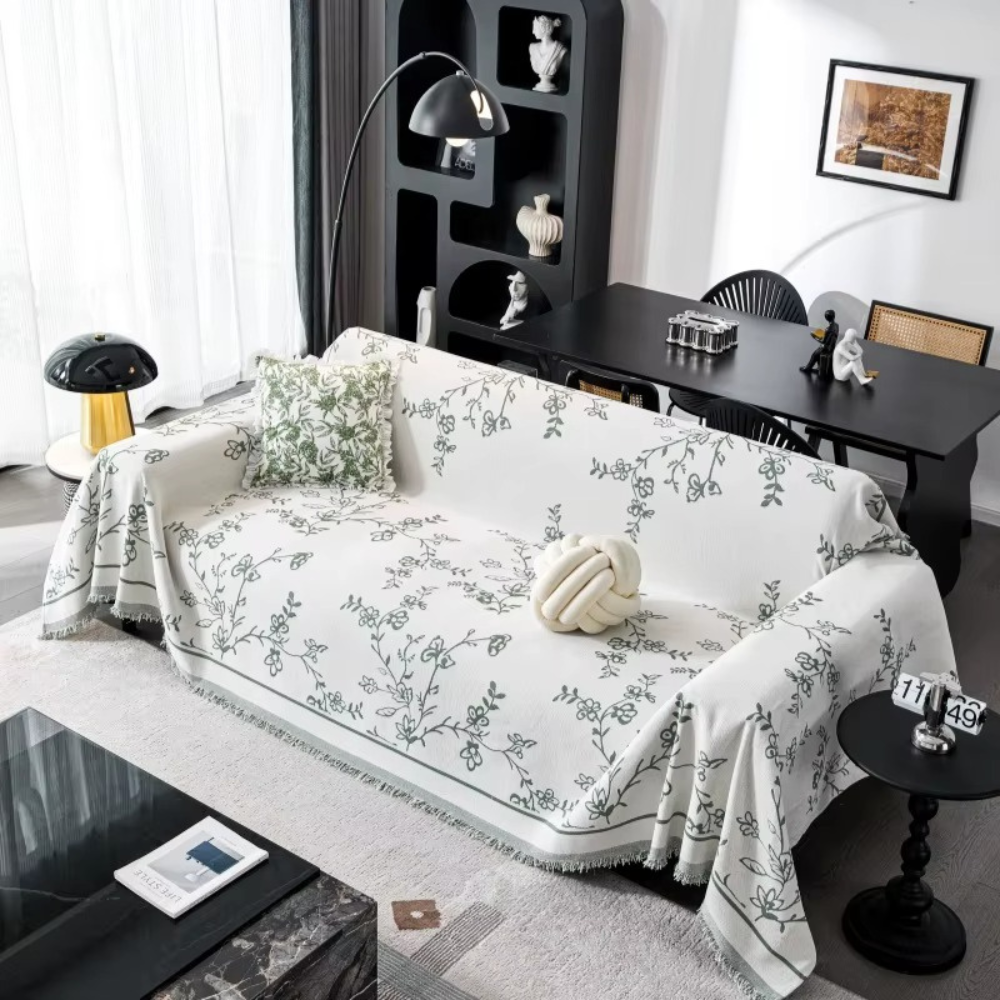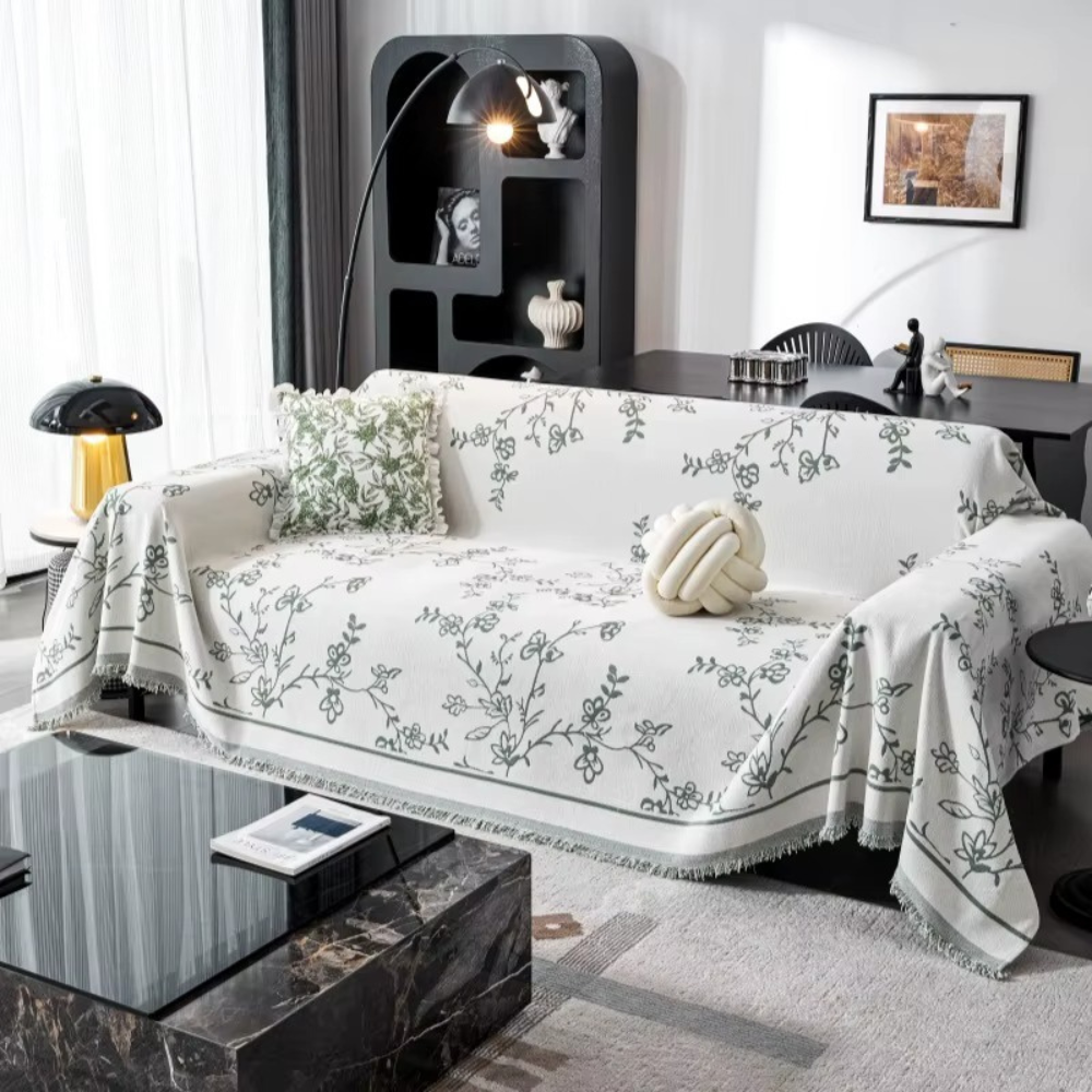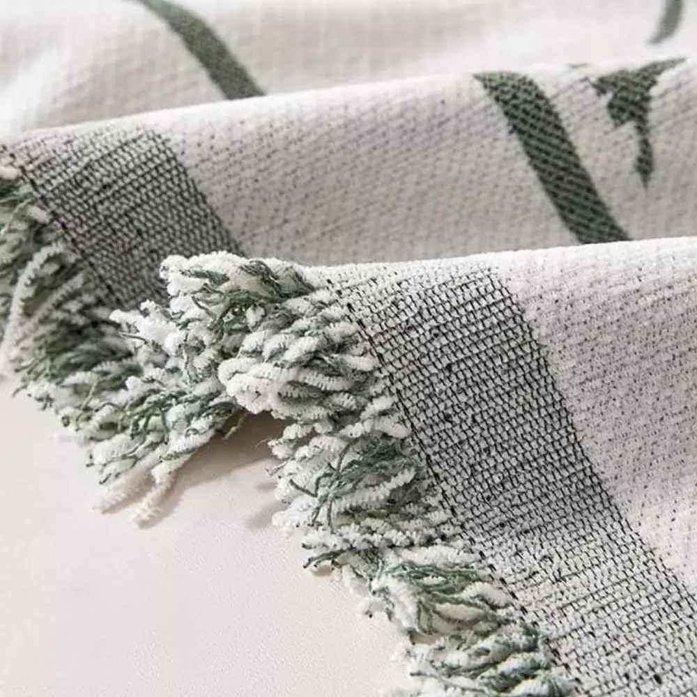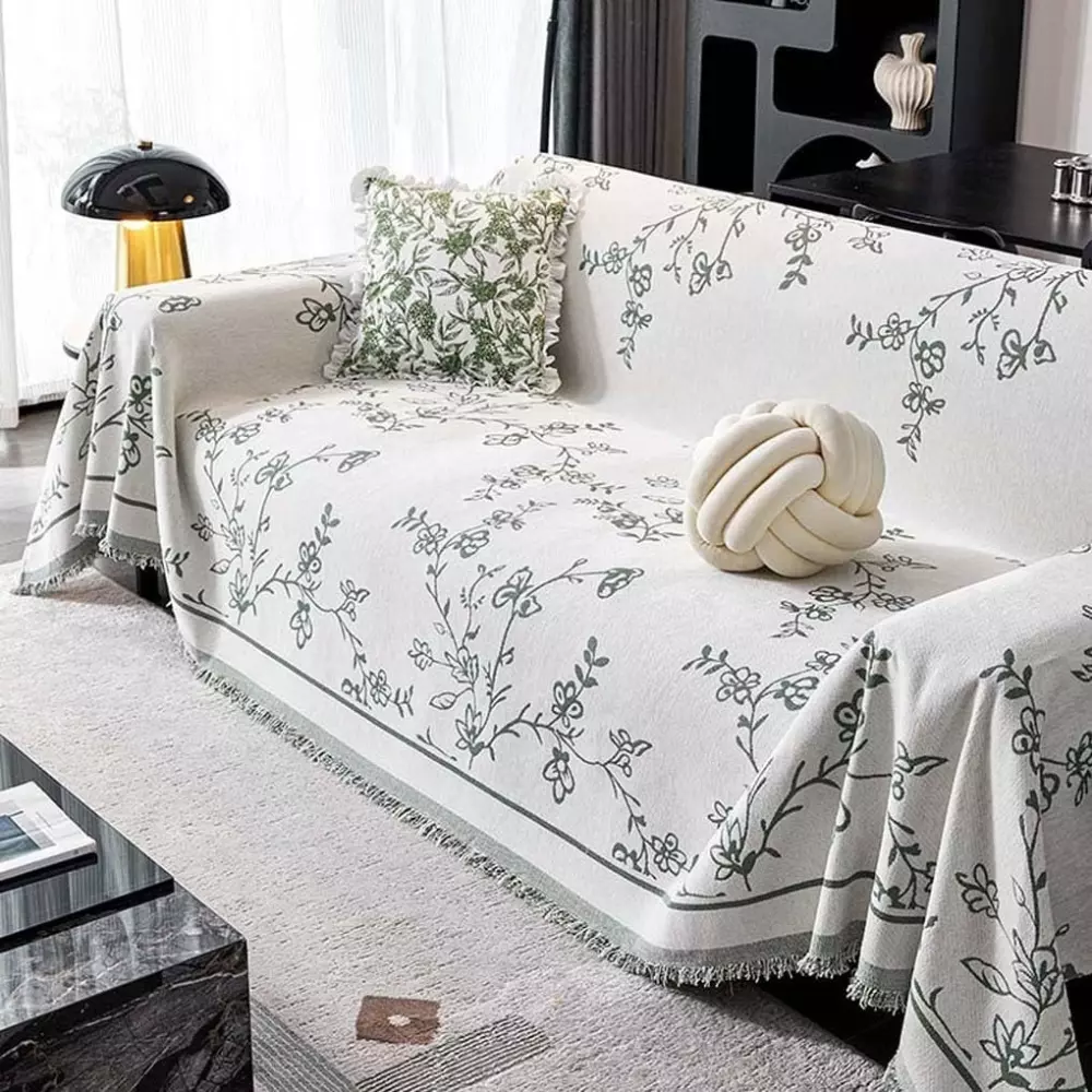 Основний колір — білий, прикрашений стильним сірим квітковим візерунком, що надає інтер'єру свіжості, затишку і яскравого акценту. По краях покривало декороване бахромою, яка додає вишуканий штрих.