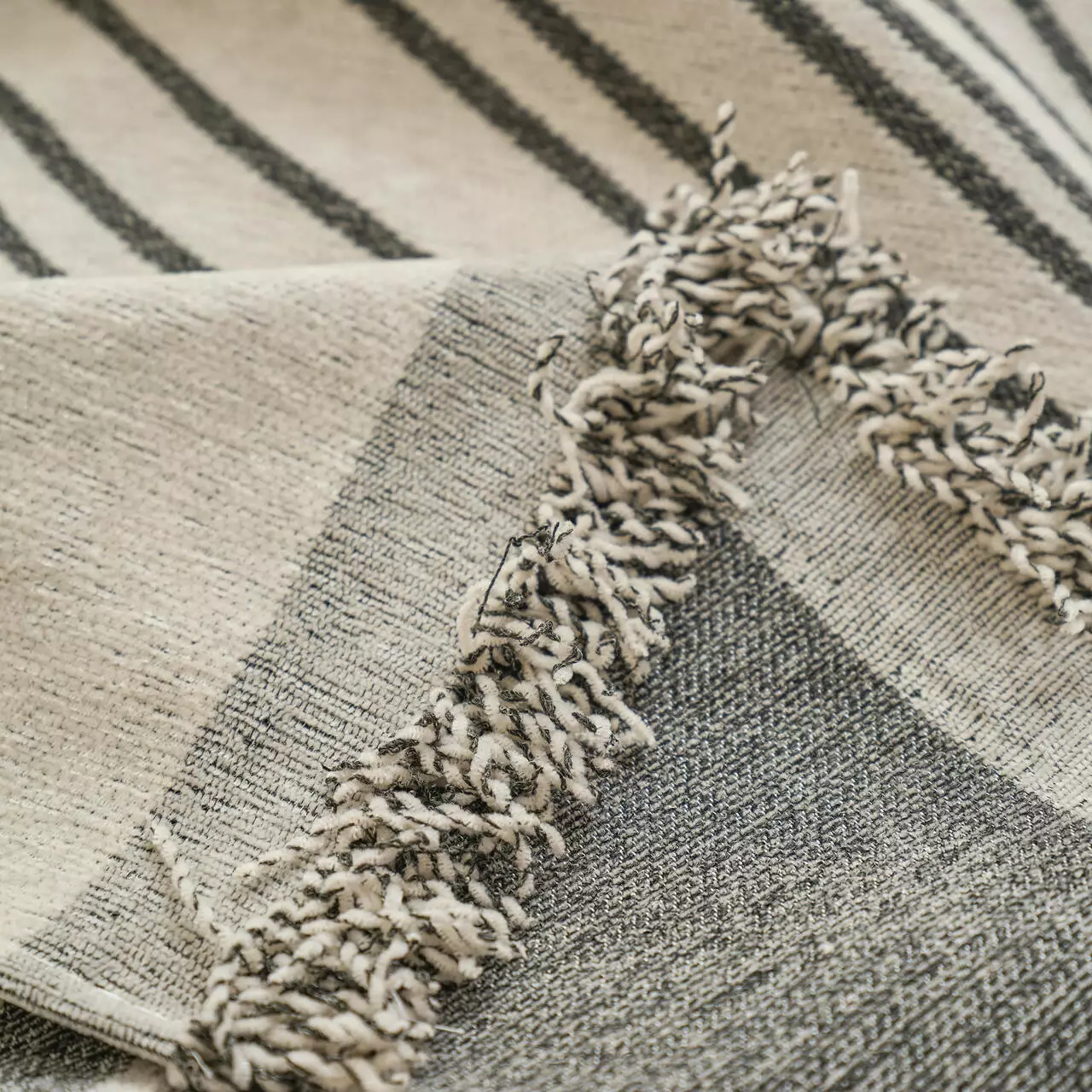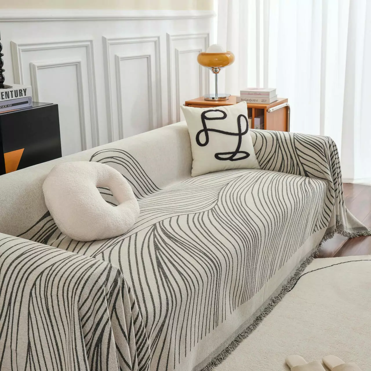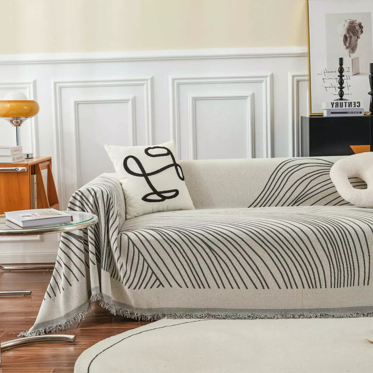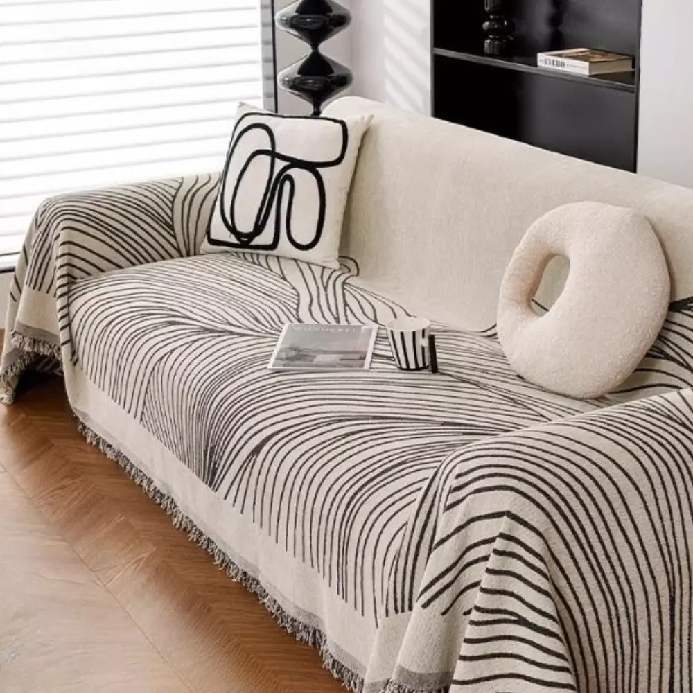 Основний колір-бежевий, прикрашений стильним сірим смугастим візерунком, який додасть затишку і гармонійно впишеться в сучасний інтер'єр. Підходить для використання як чохол-накидка на диван, крісло або ліжко.