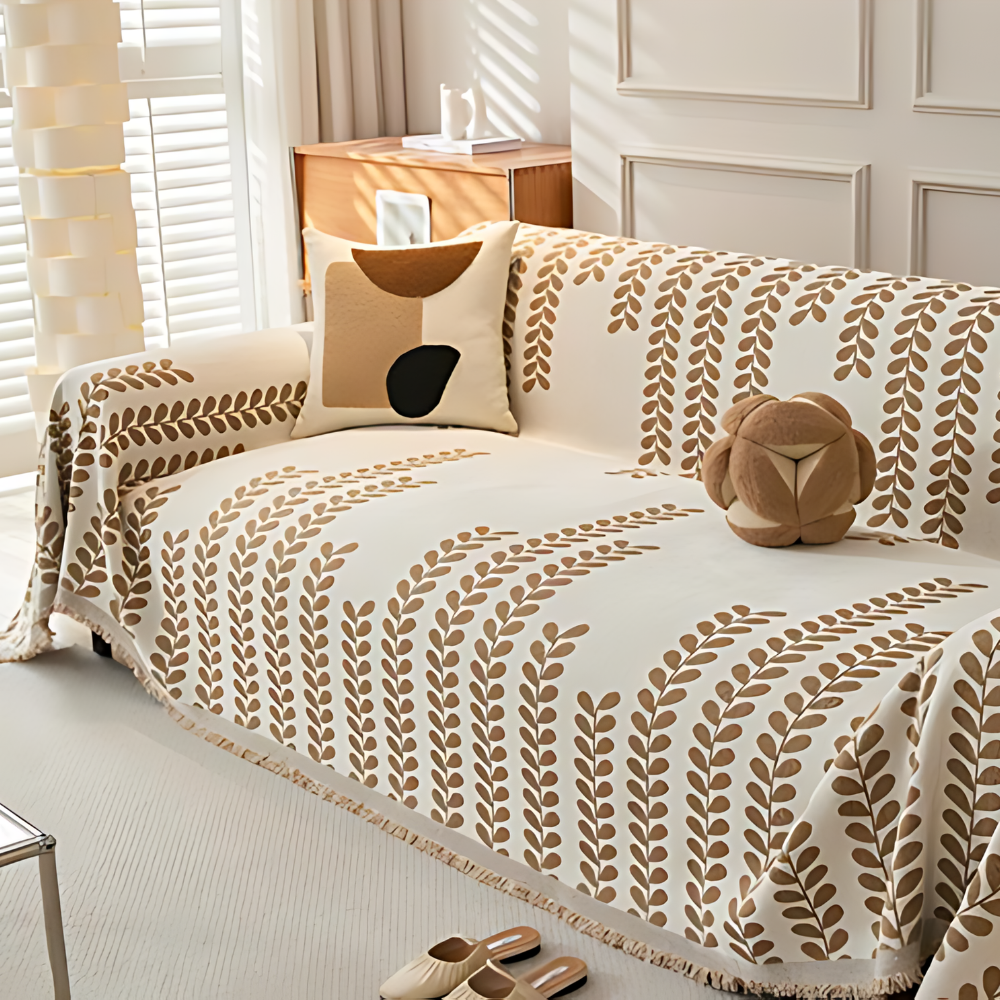 Основний колір — білий, доповнений стильним візерунком у вигляді бежевих колосків, що додасть затишку та гармонійно поєднається з сучасним інтер’єром. Підходить для використання як чохол-накидка на диван, крісло чи ліжко.