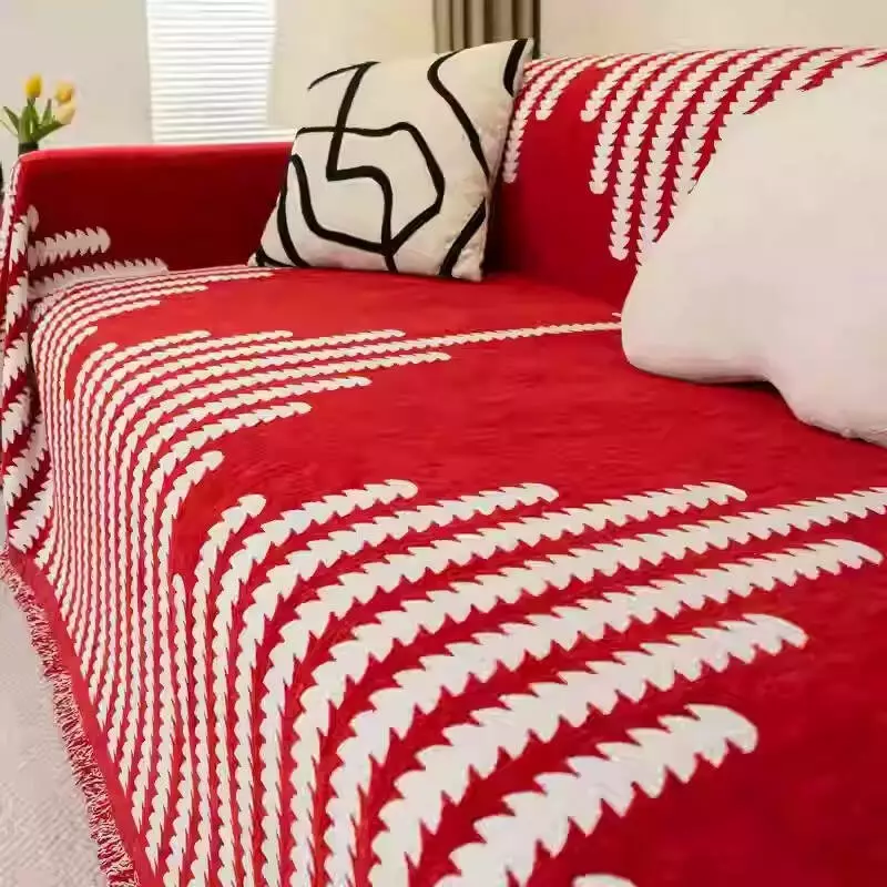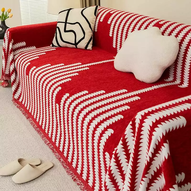 Червоне тло прикрашене виразним білим візерунком у вигляді смуг з декоративним ефектом, що робить покривало яскравим акцентом в інтер’єрі. Краї оздоблені акуратною бахромою.