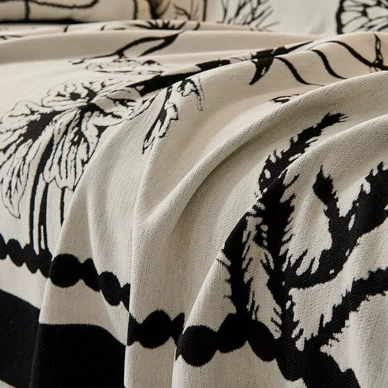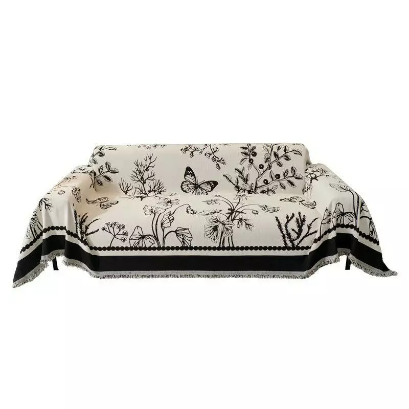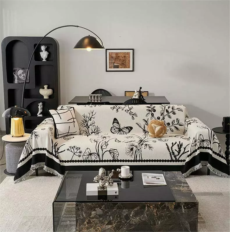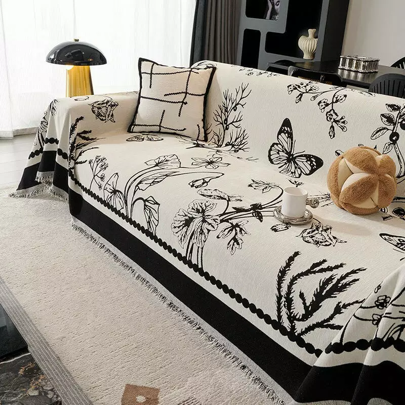 Основний колір — білий, візерунок виконаний у чорному кольорі з витонченим малюнком метелика та рослин. Таке покривало не лише захистить меблі від забруднень і пошкоджень, але й додасть інтер’єру елегантності та затишку. Підходить для використання як чохол-накидка на диван, крісло чи ліжко.