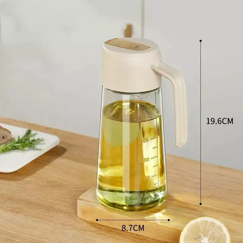 Пляшка оснащена автоматичною кришкою, яка відкривається під час нахилу, що забезпечує легке і чисте використання. Кришка щільно прилягає, запобігаючи проливанню олії та зберігаючи її свіжість протягом тривалого часу. Автоматична функція дає змогу наливати олію однією рукою, роблячи процес максимально зручним і швидким.