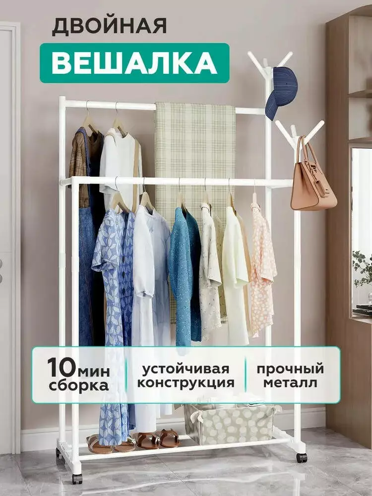 Подвійна вішалка для одягу з полицею на колесиках 145х80х42 см, складна вішалка для мінмалстичних кімнат