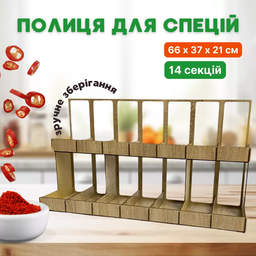 Двоярусна дерев'яна підставка для спецій ідеально впишеться в інтер'єр вашої кухні, створюючи зручність і порядок у зберіганні. Цей стильний органайзер оснащений 14 секціями, які дають змогу розмістити банки зі спеціями або інше кухонне приладдя компактно і доступно. Верхня полиця шириною 12 см ідеально підходить для більших ємностей або декоративних елементів.
