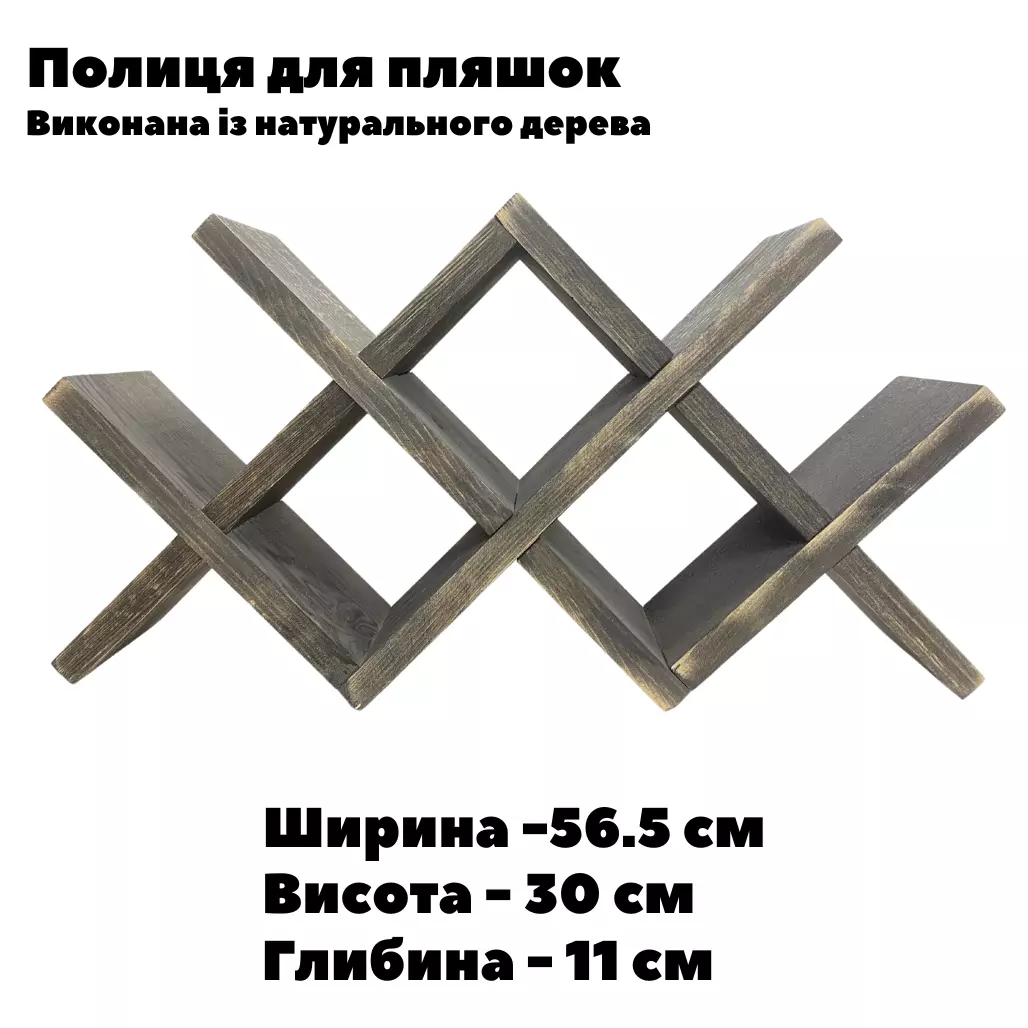 Її компактні розміри - ширина 56,5 см, висота 30 см і глибина 11 см - дозволяють легко розмістити цю полицю на столі, комоді або шафі. Вона стане не лише функціональним елементом для зберігання вина, але й стильним акцентом у вашому інтер'єрі.