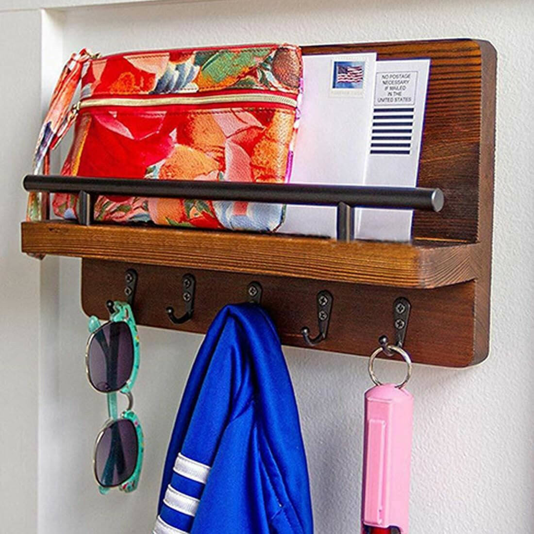 Полиця підвісна для зберігання дрібниць та аксесуарів, дерев'яна, для кухні, передпокою, ванної, 5 гачків, 30х18х7,5 см, коричнева