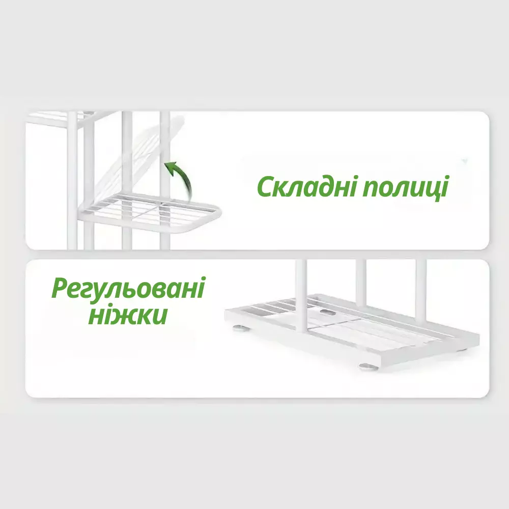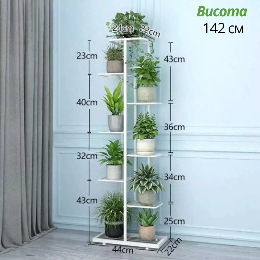 Міцна конструкція і стійка основа роблять стелаж надійним і довговічним. Полиці розраховані на навантаження до 6 кг, що дозволяє розміщувати на них як невеликі горщики, так і більші рослини. Металева конструкція покрита спеціальною фарбою, що запобігає корозії і зберігаючи зовнішній вигляд на довгі роки. Гумові ніжки регулюються по висоті, завдяки чому стелаж стійкий навіть на нерівних поверхнях, а також не пошкоджує підлоги.