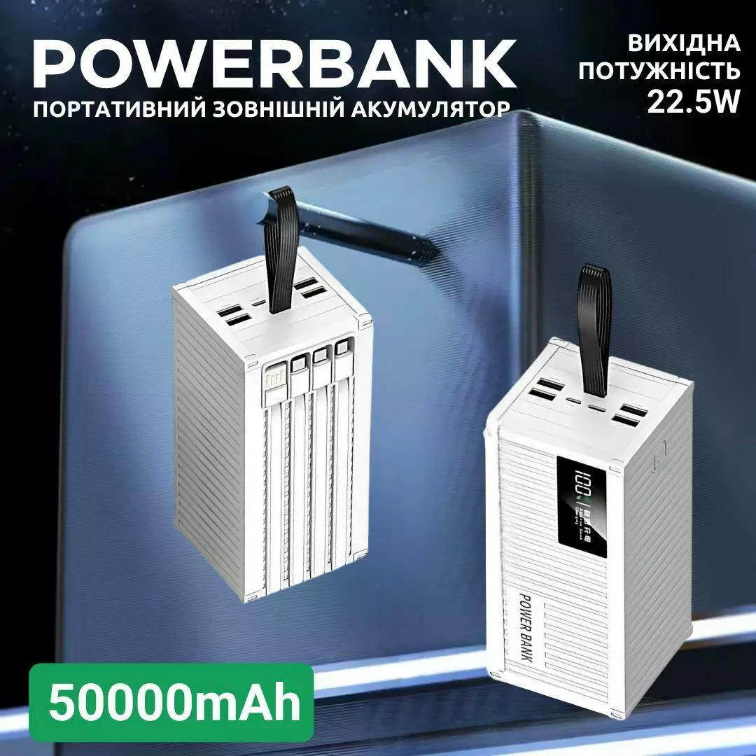 Портативний зовнішній акумулятор, потужний павербанк 20000мАг, Powerbank зі швидкою зарядкою та кабелями White