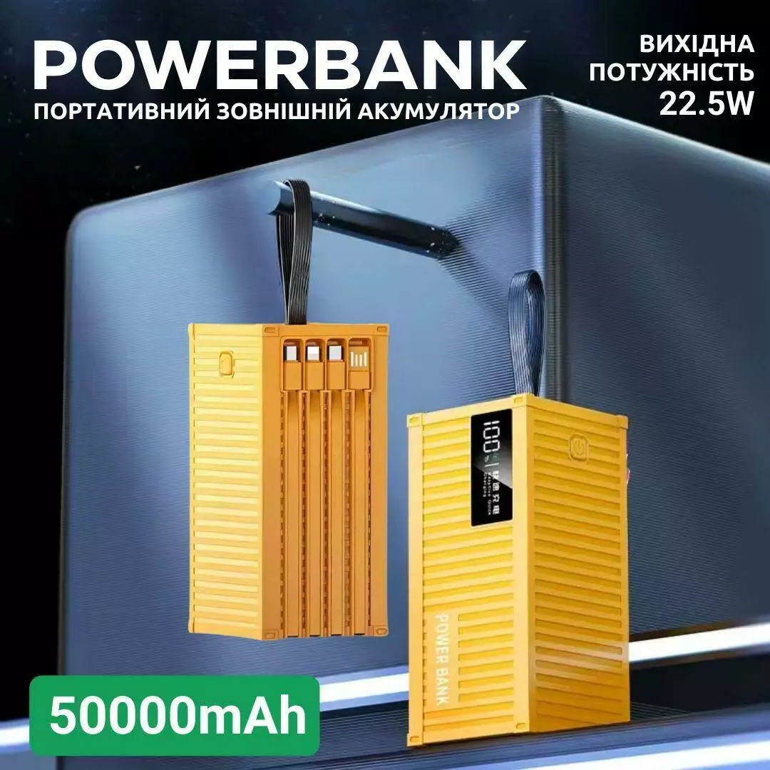 Портативний зовнішній акумулятор, потужний павербанк 20000мАг, Powerbank зі швидкою зарядкою та кабелями Yellow